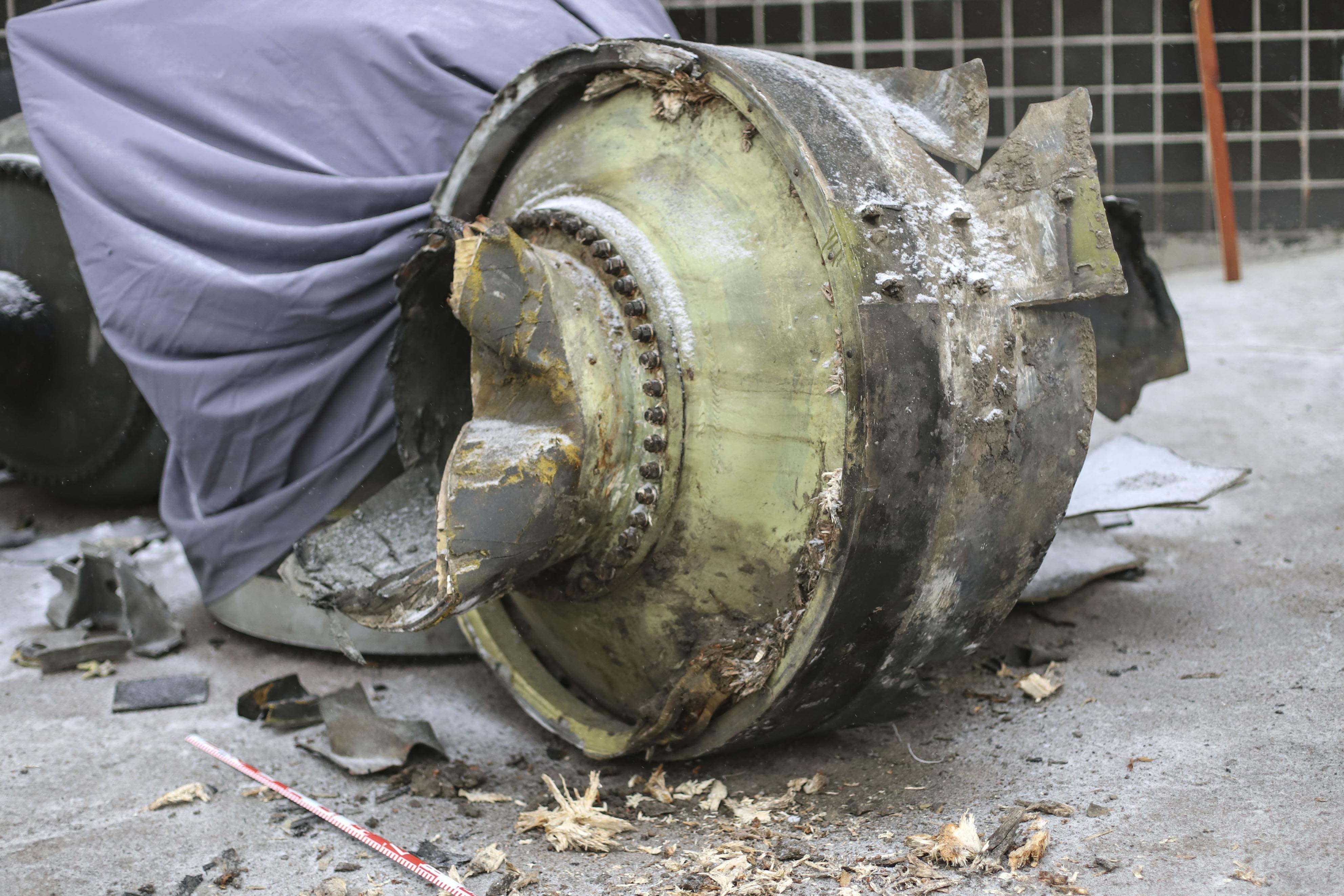 Photo taken in Kyiv, Ukraine, in January 2024 shows debris identified to be that of a North Korean KN-23 short-range ballistic missile. (Kyodo)