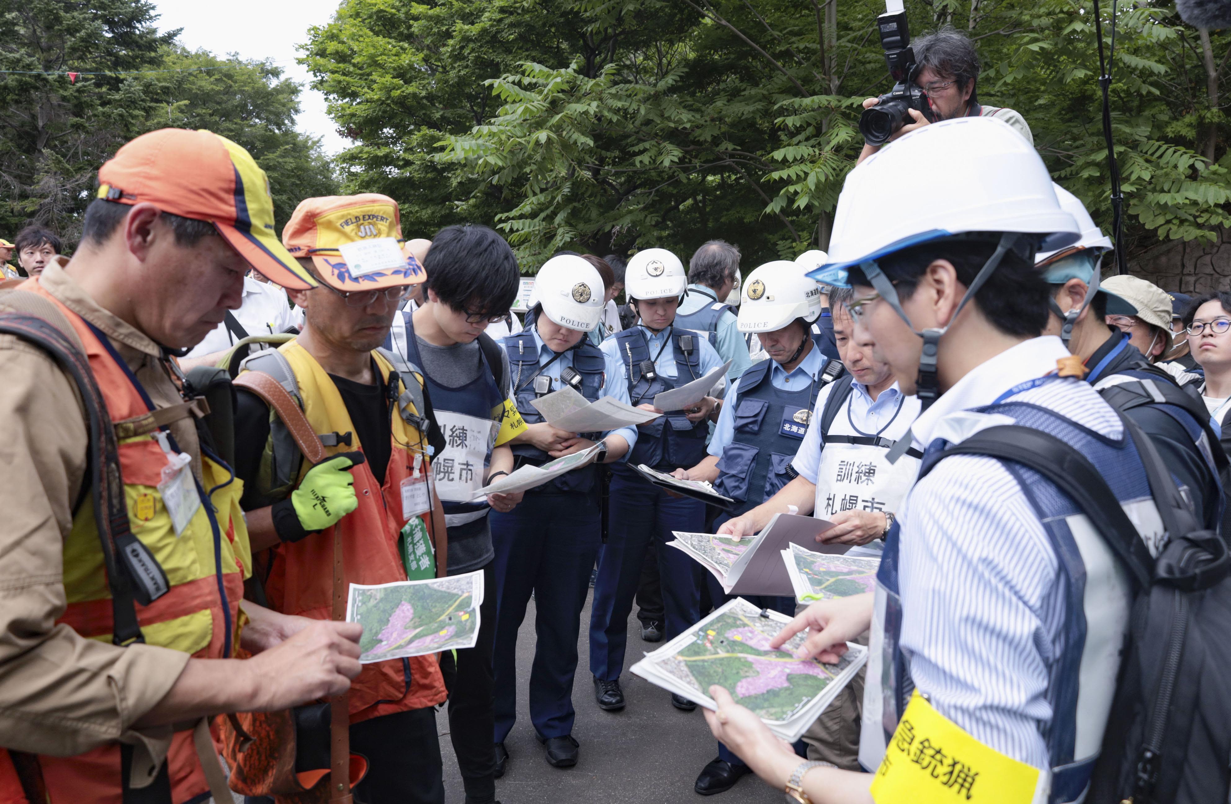 圖為參加棕熊「緊急槍獵」應對訓練的北海道警方和札幌市職員等。8月攝於札幌市。(共同社)