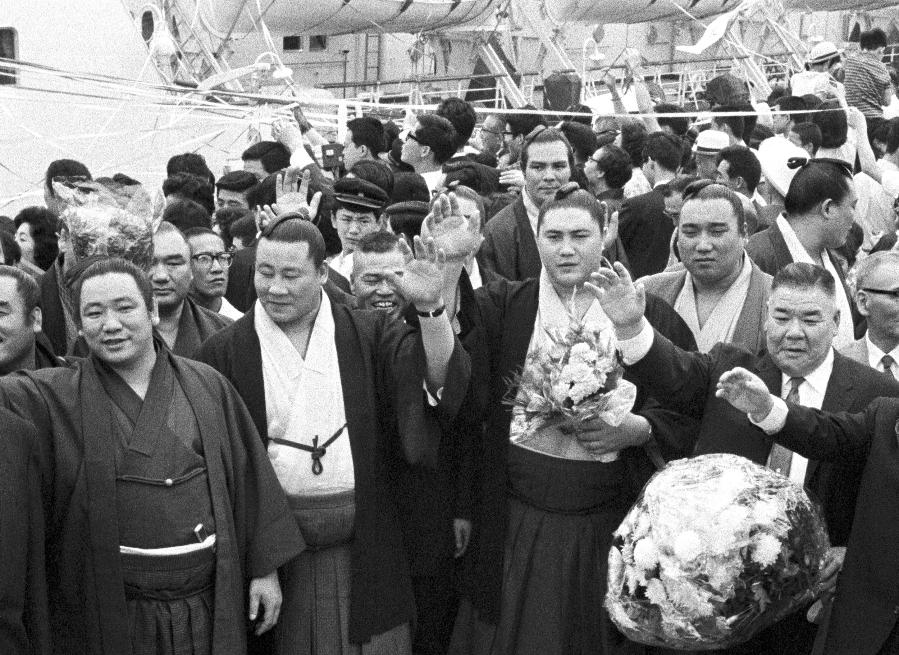 File photo shows (from L) yokozuna Kashiwado, Taiho, Sadanoyama and Tochinoumi and other top-division wrestlers leaving the Port of Yokohama for a sumo exhibition tour of the Soviet Union on July 25, 1965. (Kyodo)