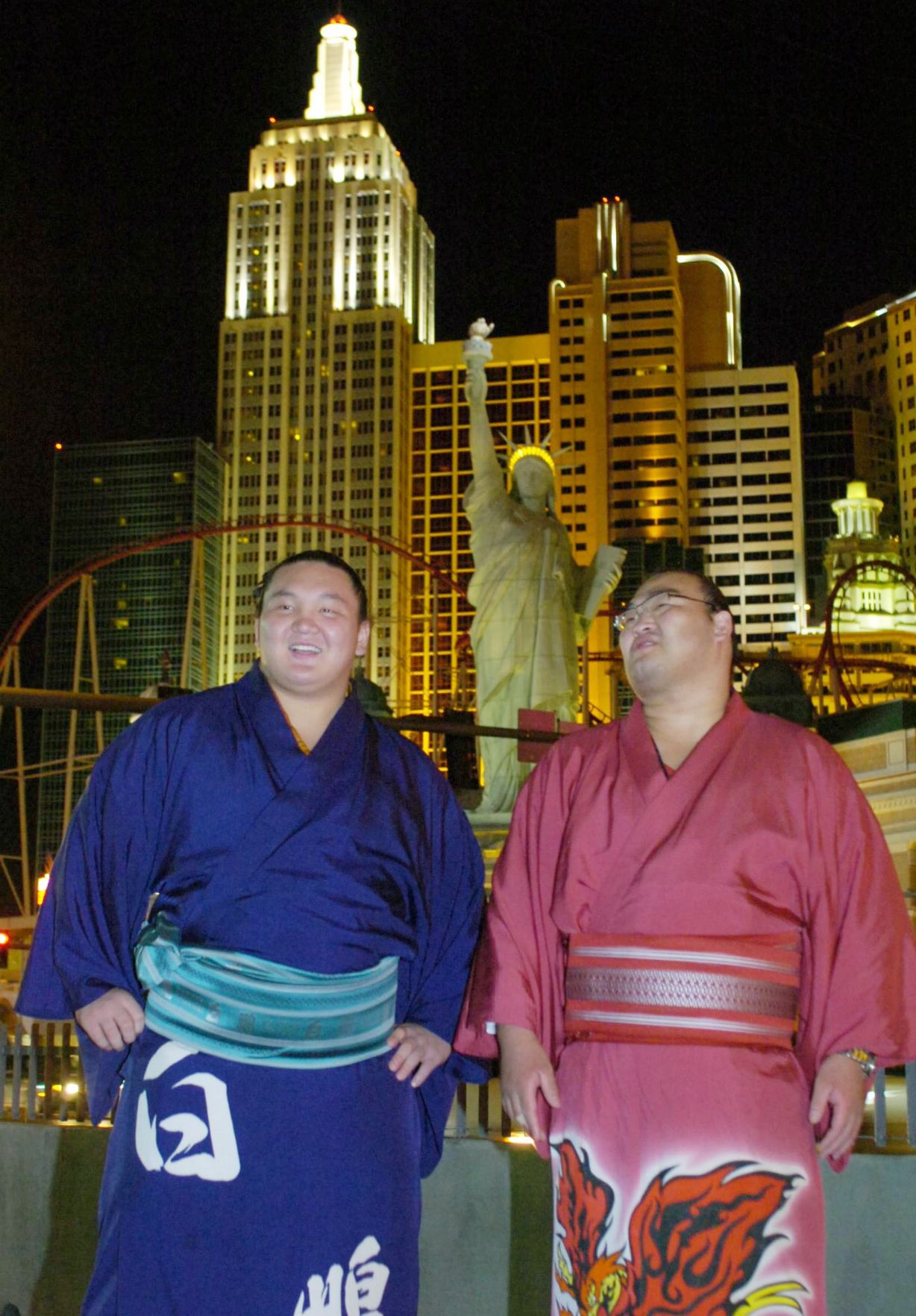 File photo shows sumo wrestler Takamisakari (R) and Mongolian wrestler Hakuho sightseeing in Las Vegas on Oct. 10, 2005. (Kyodo)