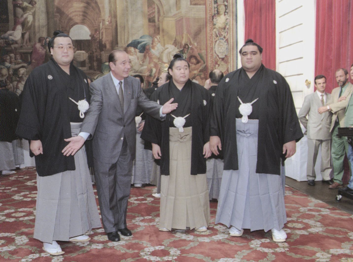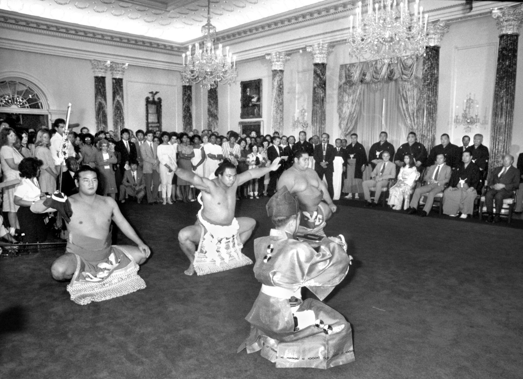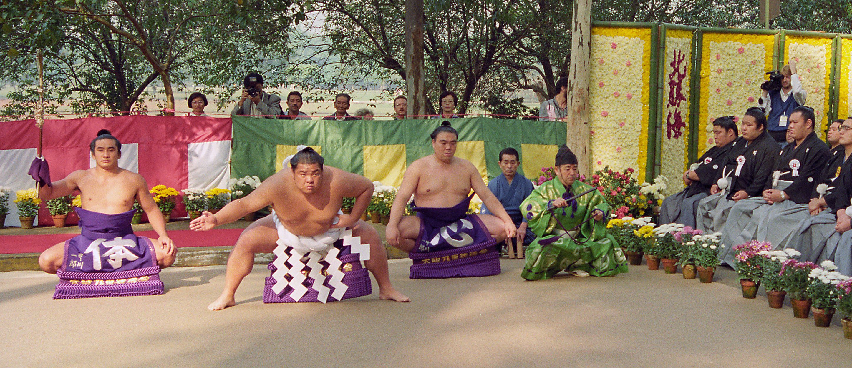 File photo shows yokozuna Hokutoumi (2nd L) performing the ring-entering ceremony at Parque do Ibirapuera in Sao Paulo, Brazil, on June 8, 1990. (Kyodo)