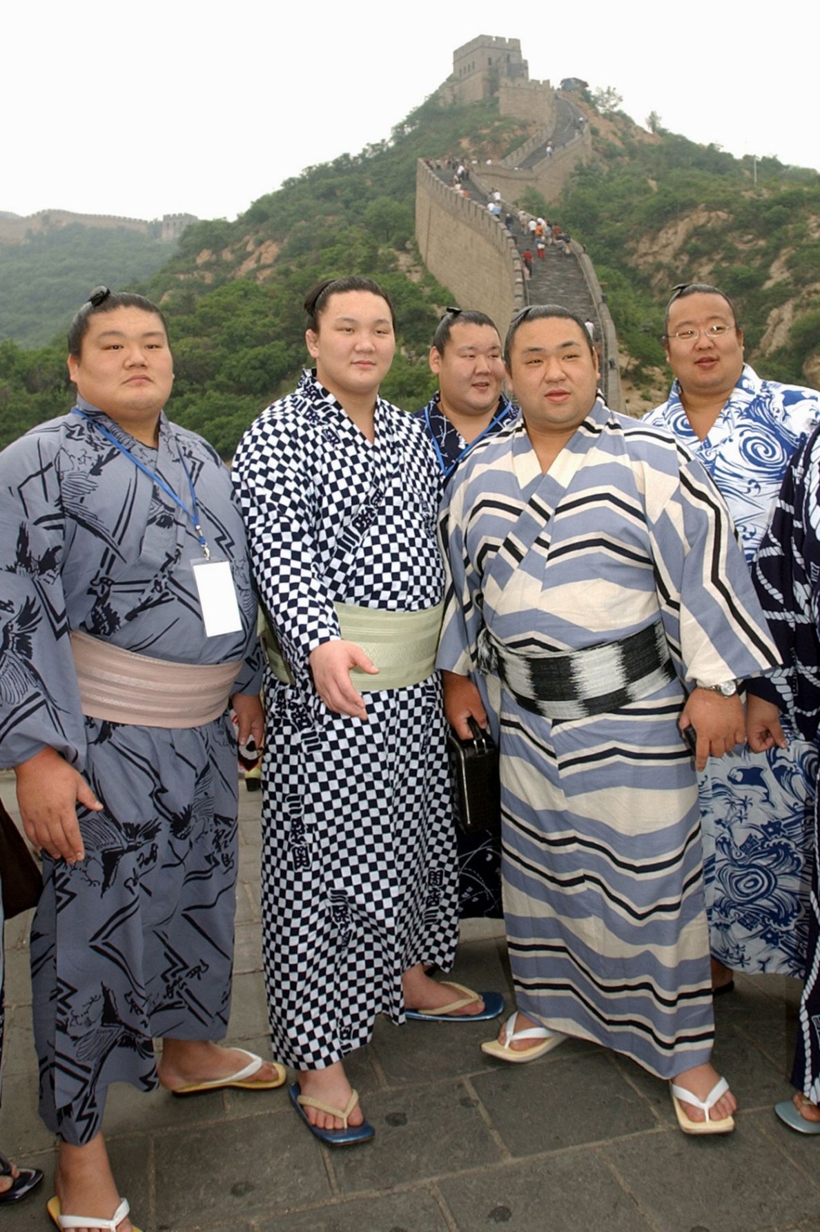 File photo shows sumo wrestlers, including ozeki Chiyotaikai (2nd R) and Mongolian wrestler Hakuho (2nd L), visiting the Great Wall of China in suburban Beijing on June 4, 2004. (Kyodo)