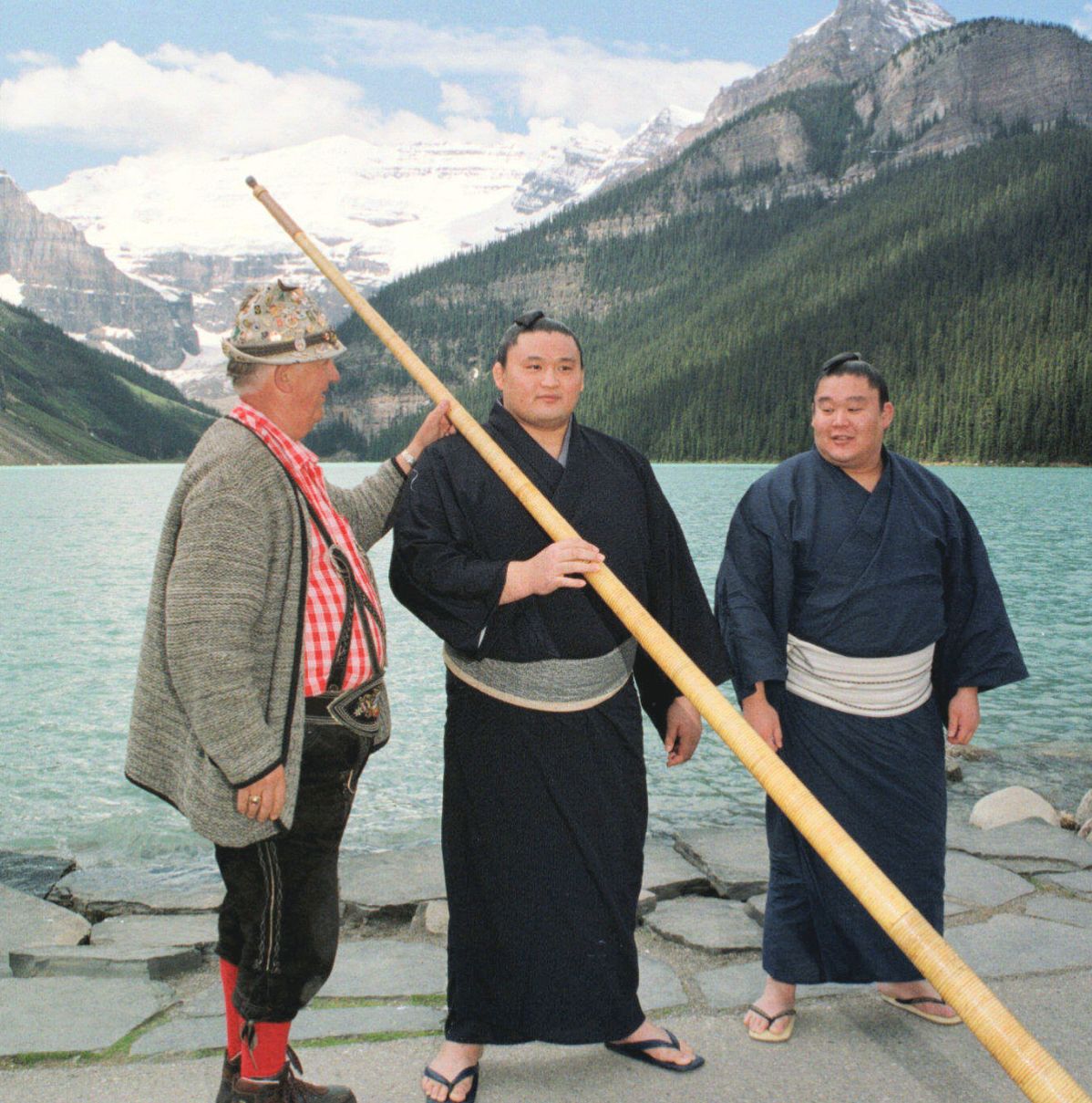File photo shows Takanohana (C) and Wakanohana (R) yokozuna brothers posing for commemorative photos in front of the glacier at Lake Louise in Canada on June 3, 1998. (Kyodo)