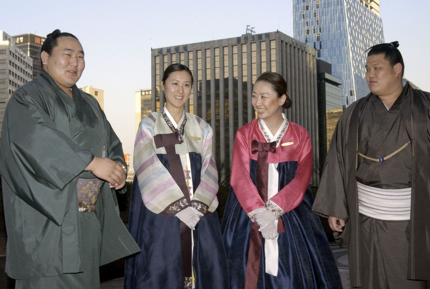File photo shows yokozuna Asashoryu (L) and Korean sumo wrestler Kasugao (R) posing for photos in Seoul on Feb. 12, 2004. (Kyodo)