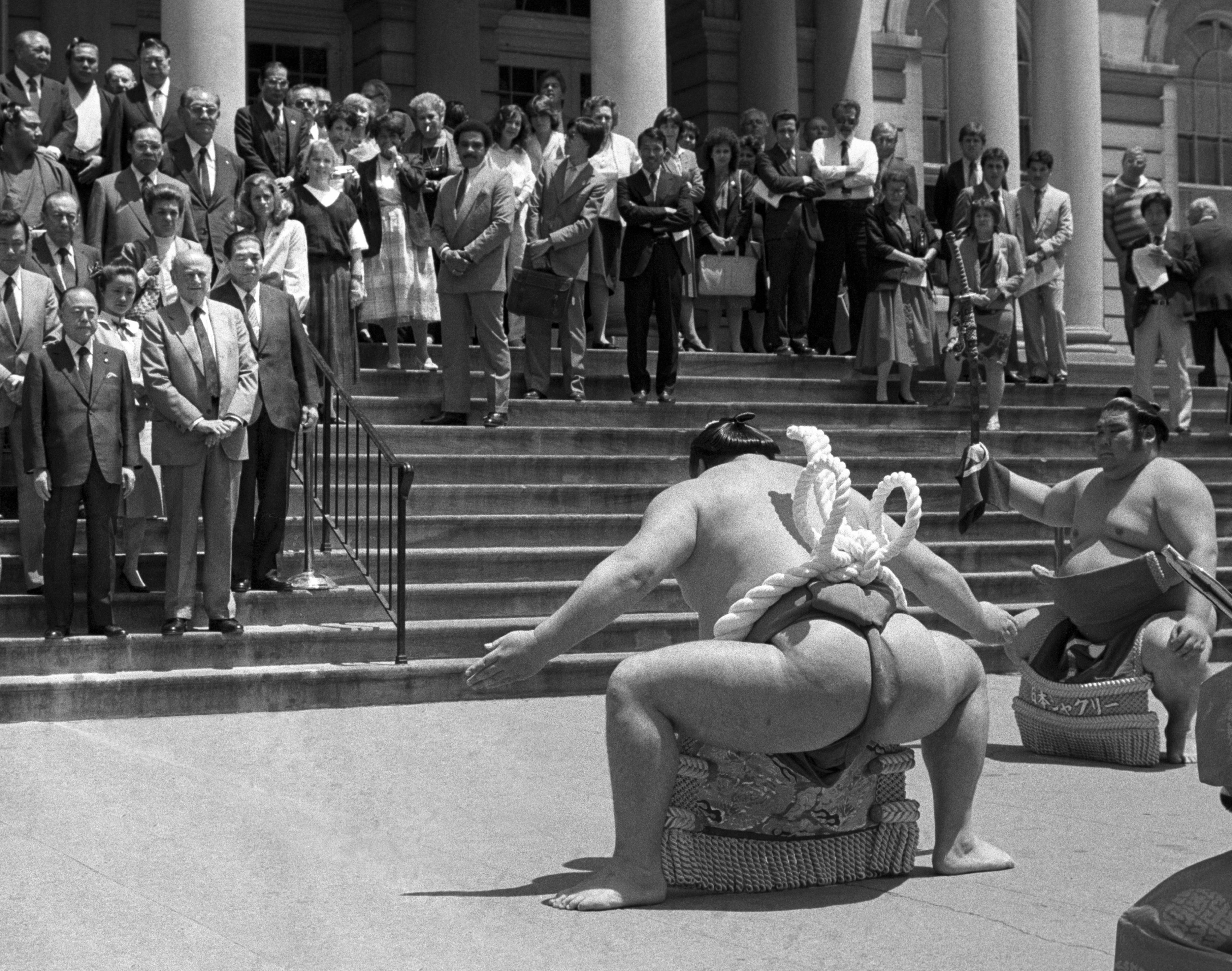大相撲紐約公演中,橫綱隆之里展示土俵入場儀式。1985年6月13日攝於美國紐約市政廳前。(共同社)