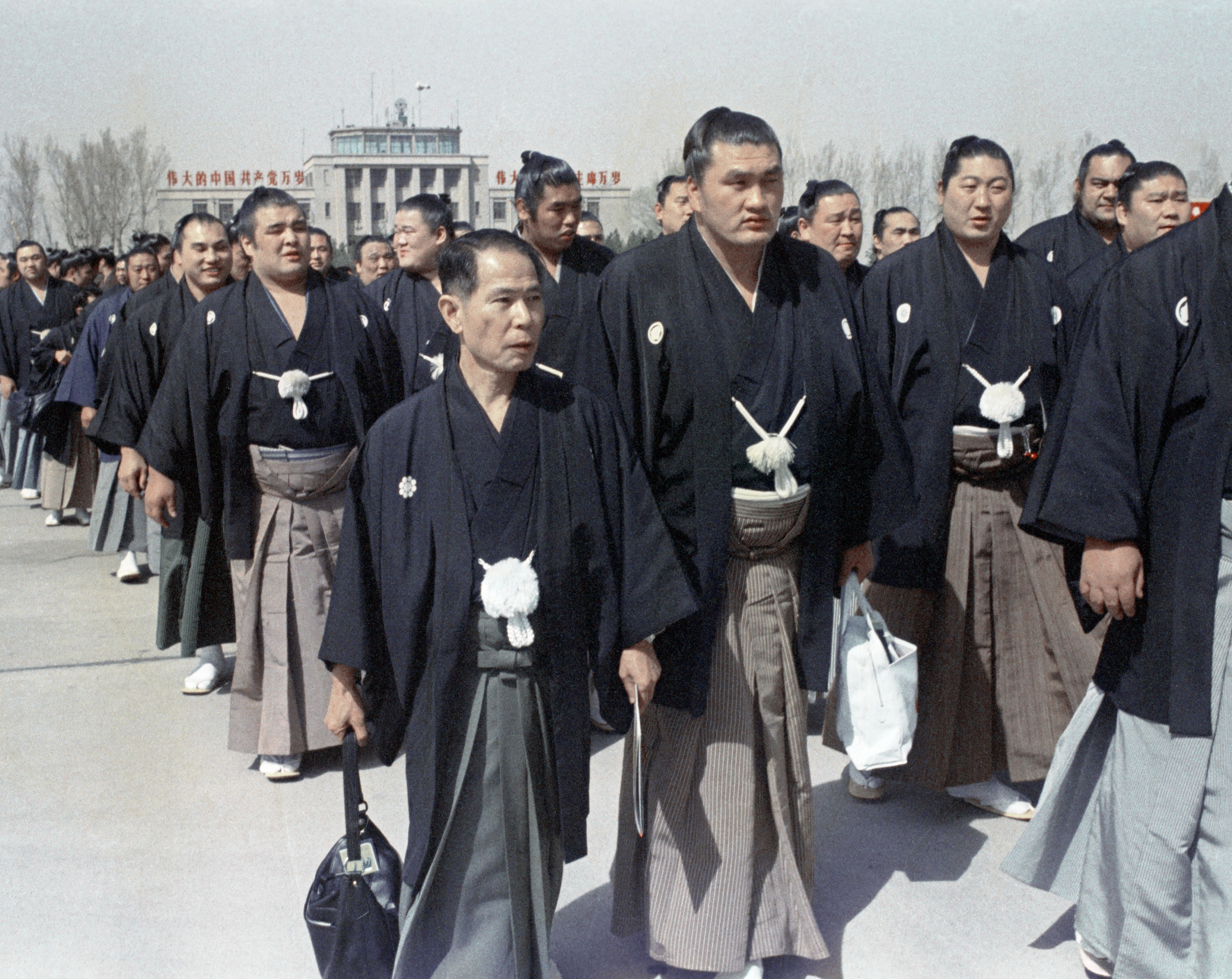 1973年4月3日,參加大相撲中國公演的力士們抵達北京機場。公演在北京舉行4天,在上海舉行2天。(共同社)