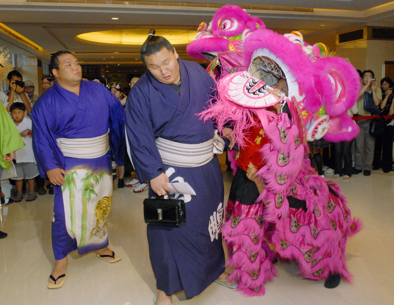 大相撲拉斯維加斯公演期間,白鵬(左)與高見盛(右)在當地觀光。2005年10月10日攝於美國拉斯維加斯。(共同社)