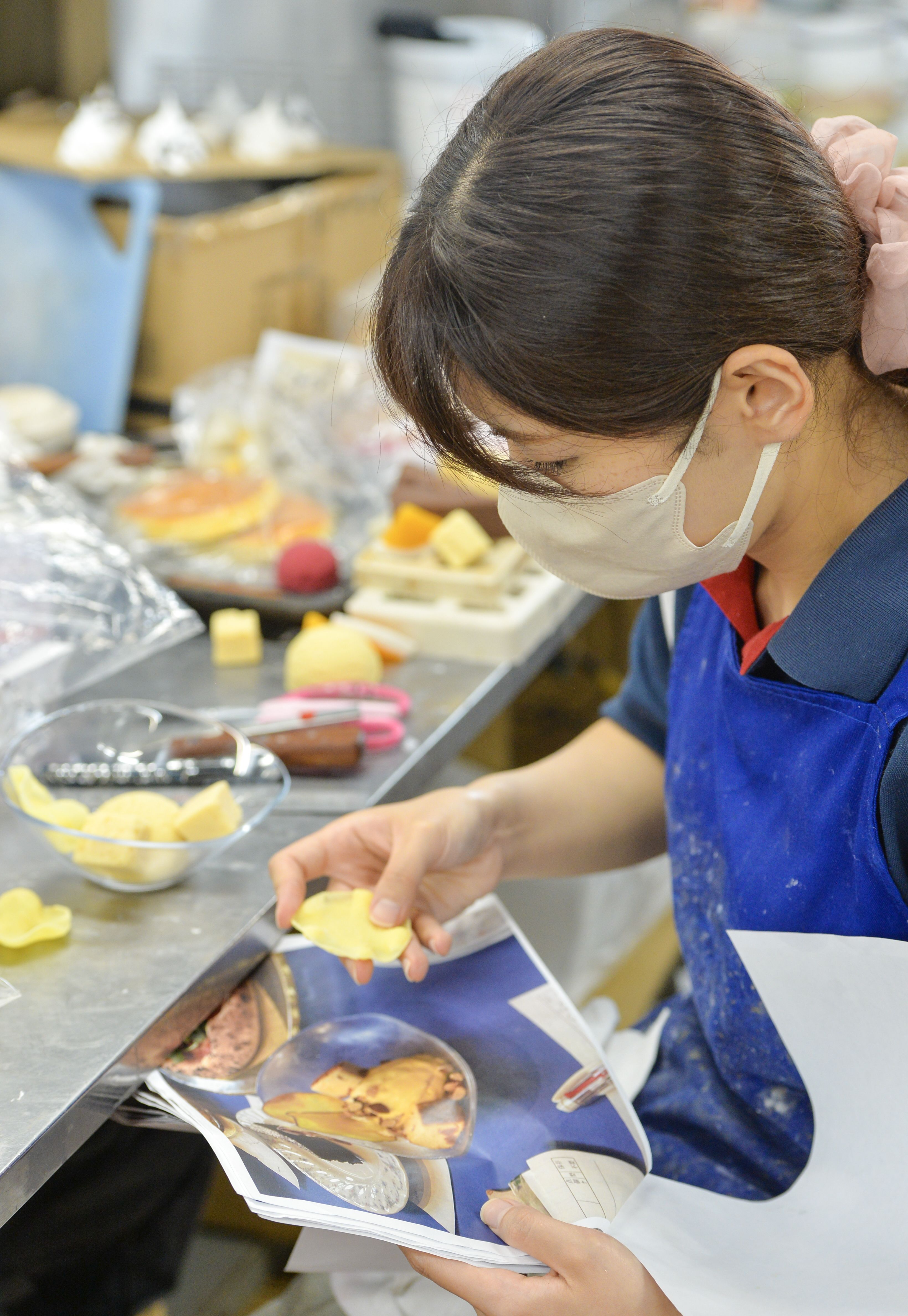 Every day, a factory in Yokohama, operated by Iwasaki group company Iwasaki Co., is bustling with 50 or so workers painstakingly crafting food replicas. The production process starts after real food is delivered in bowls or plates actually used in eateries.