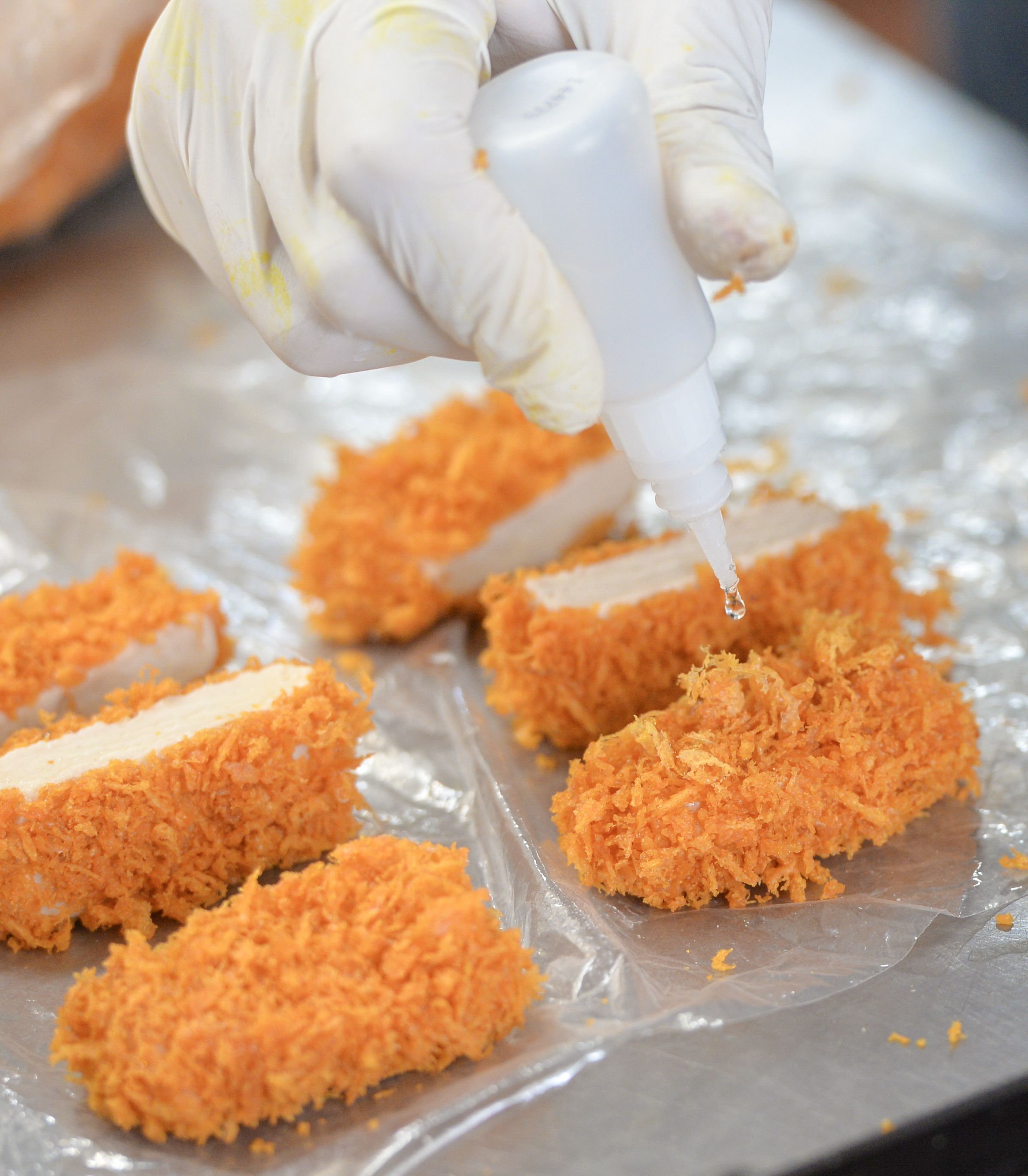 The craftsmen first take a mold of each ingredient. After plastic resin is poured into the mold and heated in the oven, the basic parts are ready for coloring.