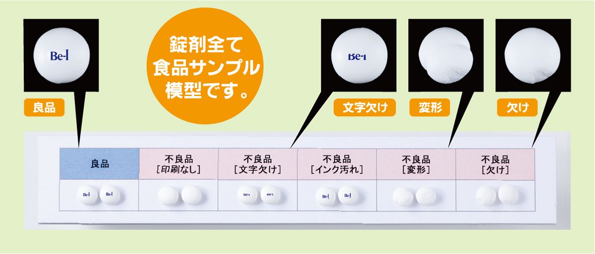 An example of food replicas used as samples to illustrate typical tablet defects in the pharmaceutical manufacturing process. (©Iwasaki Co.)