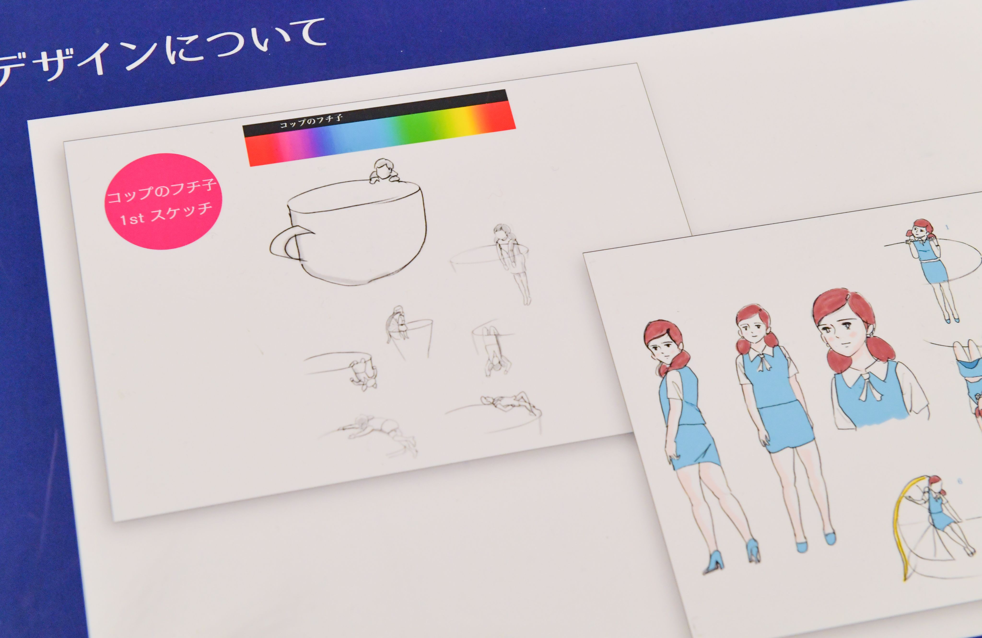 Photo shows design sketches and illustrations for the Koppu no Fuchiko capsule toy series at the Gacha Gacha Exhibition in Roppongi.