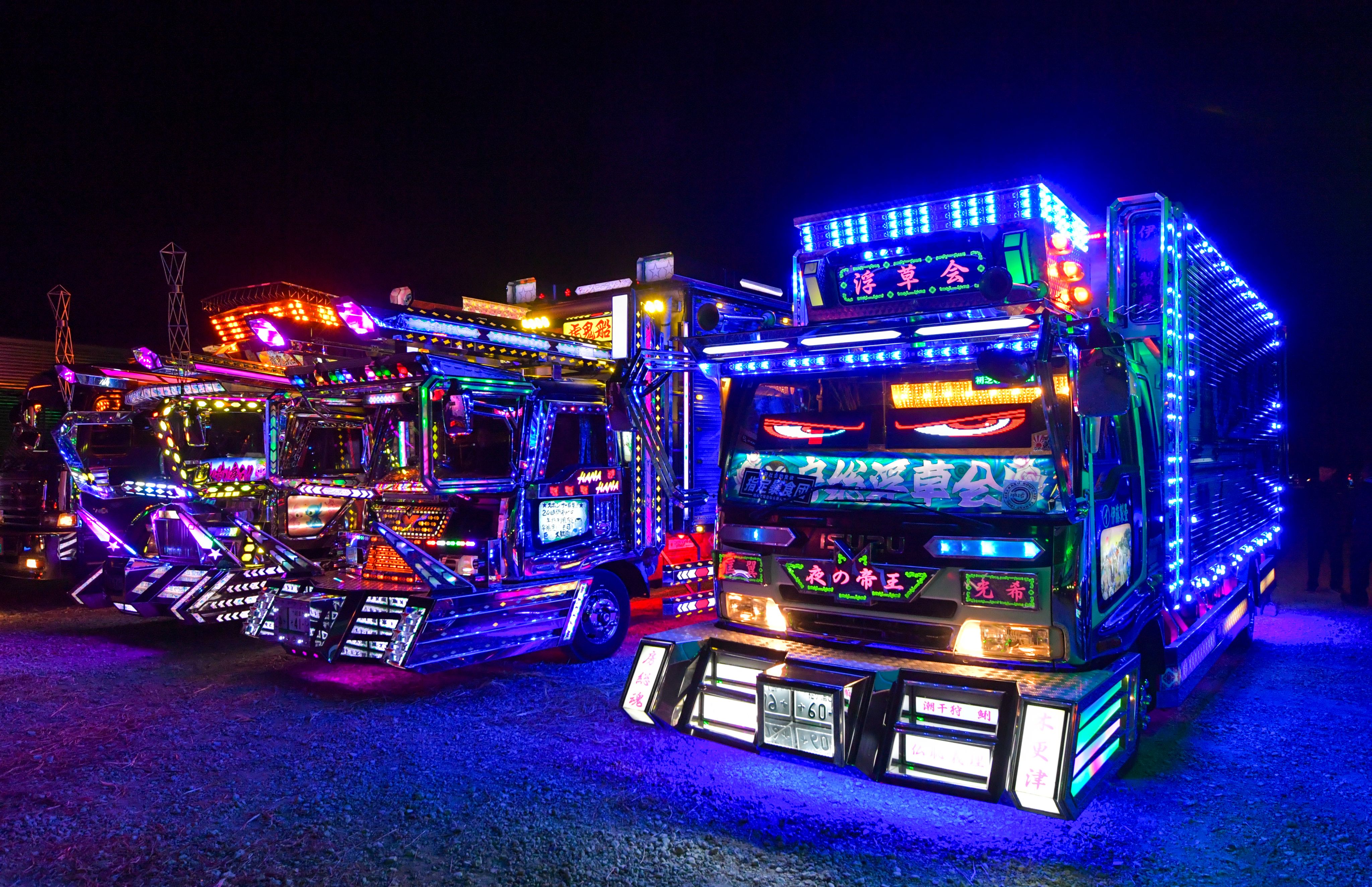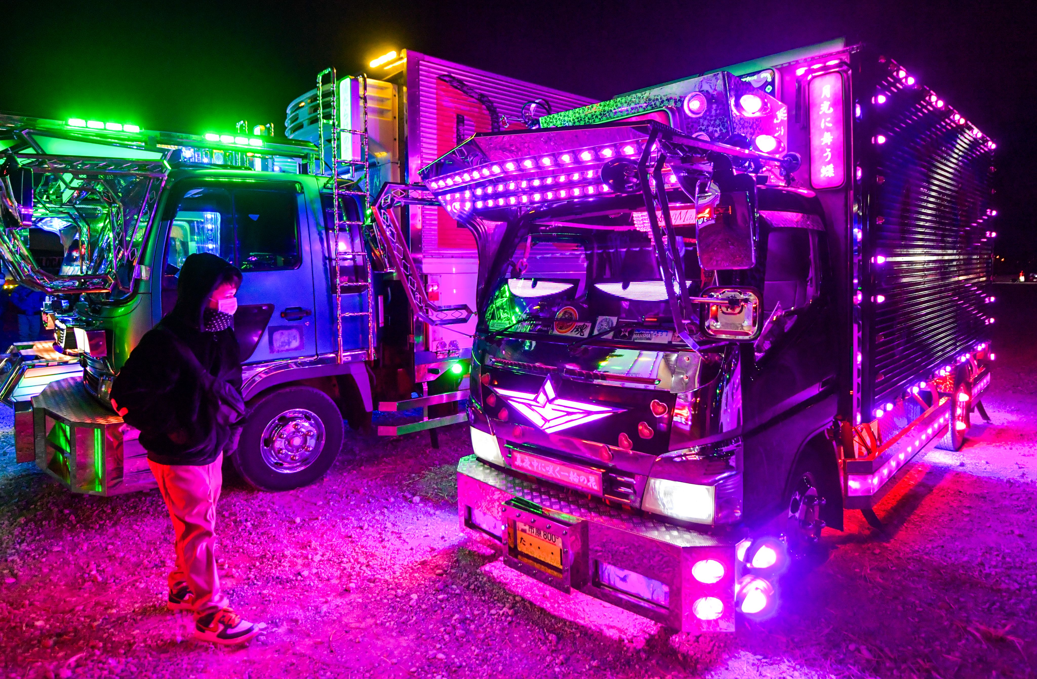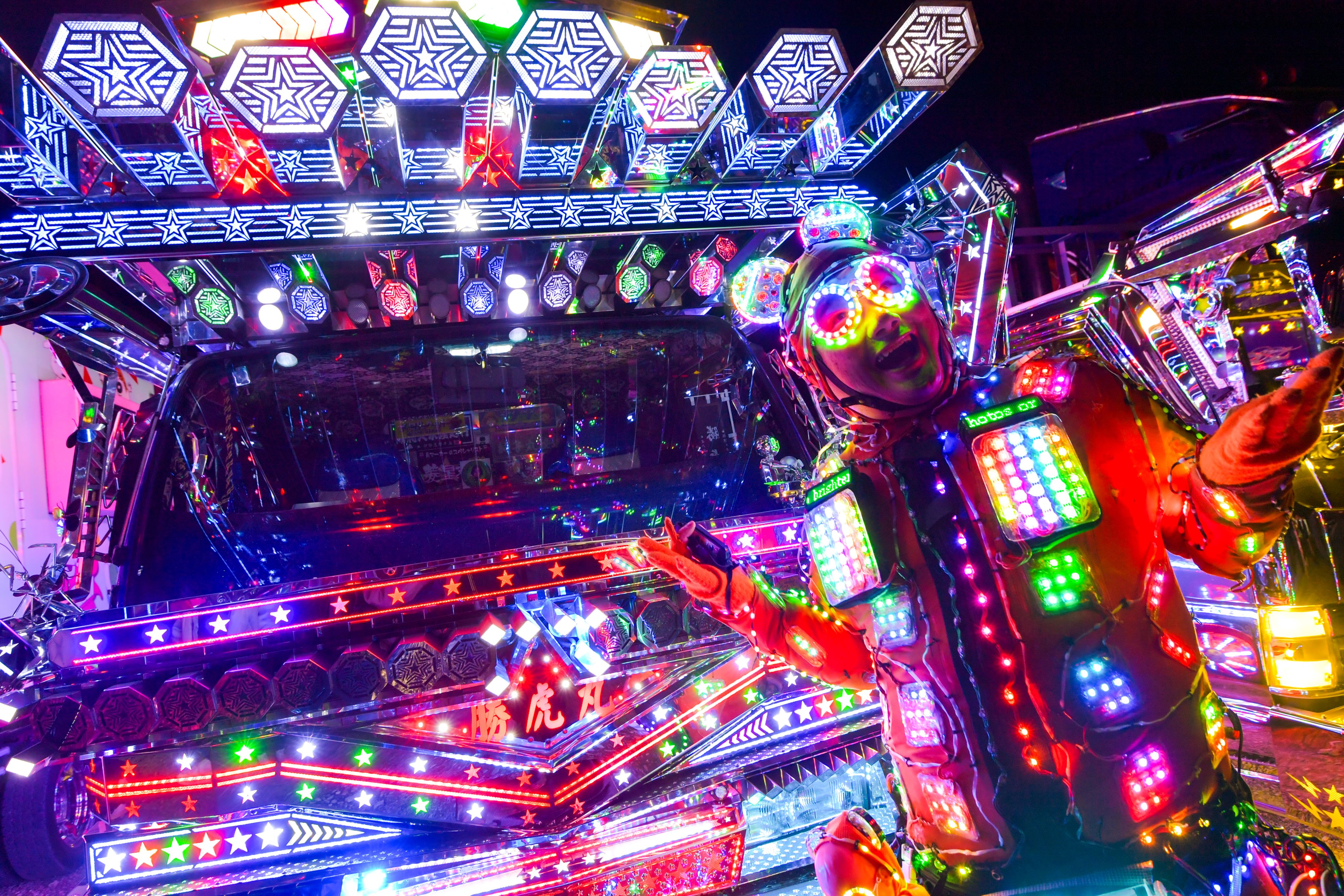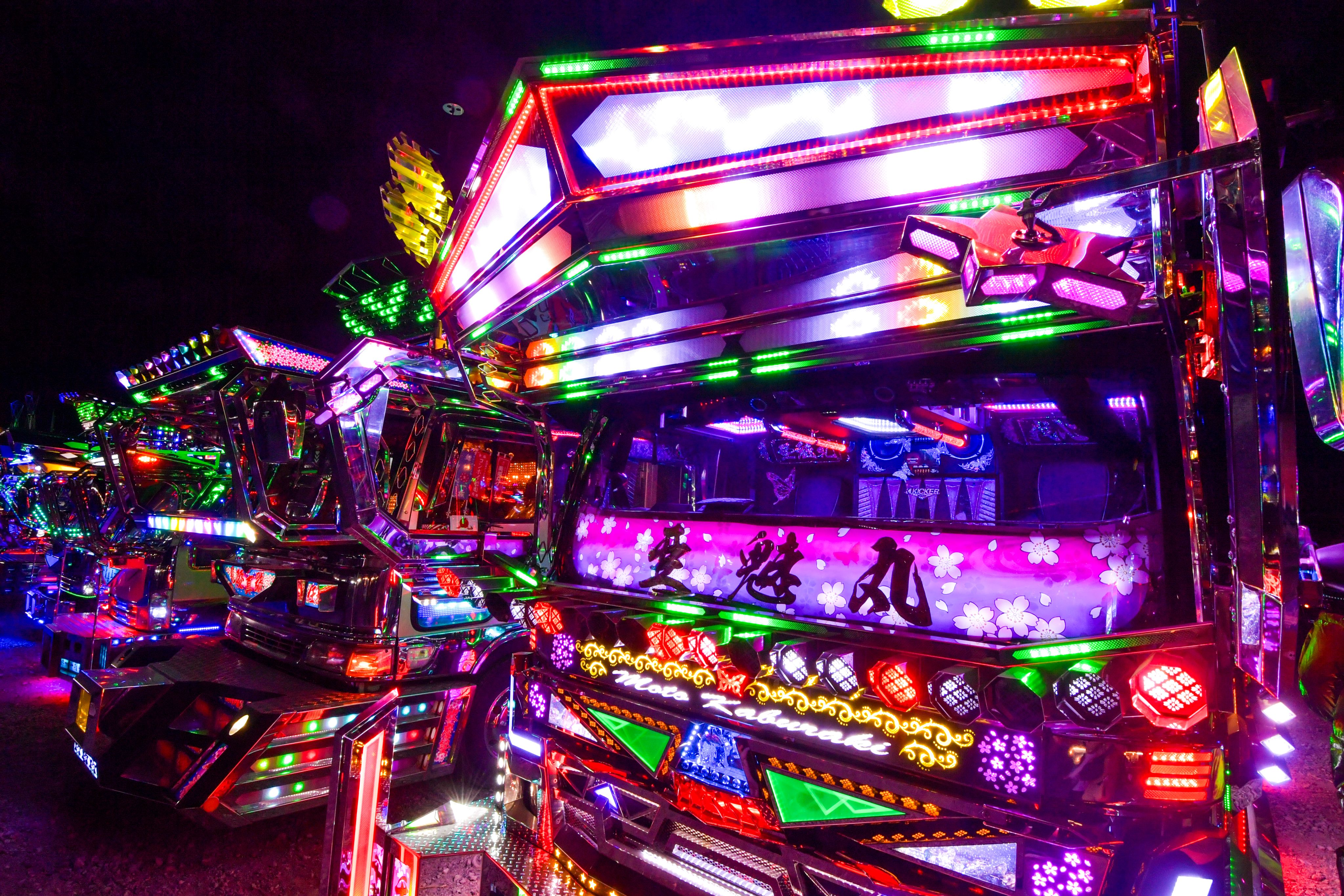 It was the country's largest assembly of decorated trucks, or "dekotora" as they are known in Japanese, which were fully illuminated in all their gaudy glory to the delight of thousands of attendees at a countdown event in Fukaya, Saitama Prefecture.