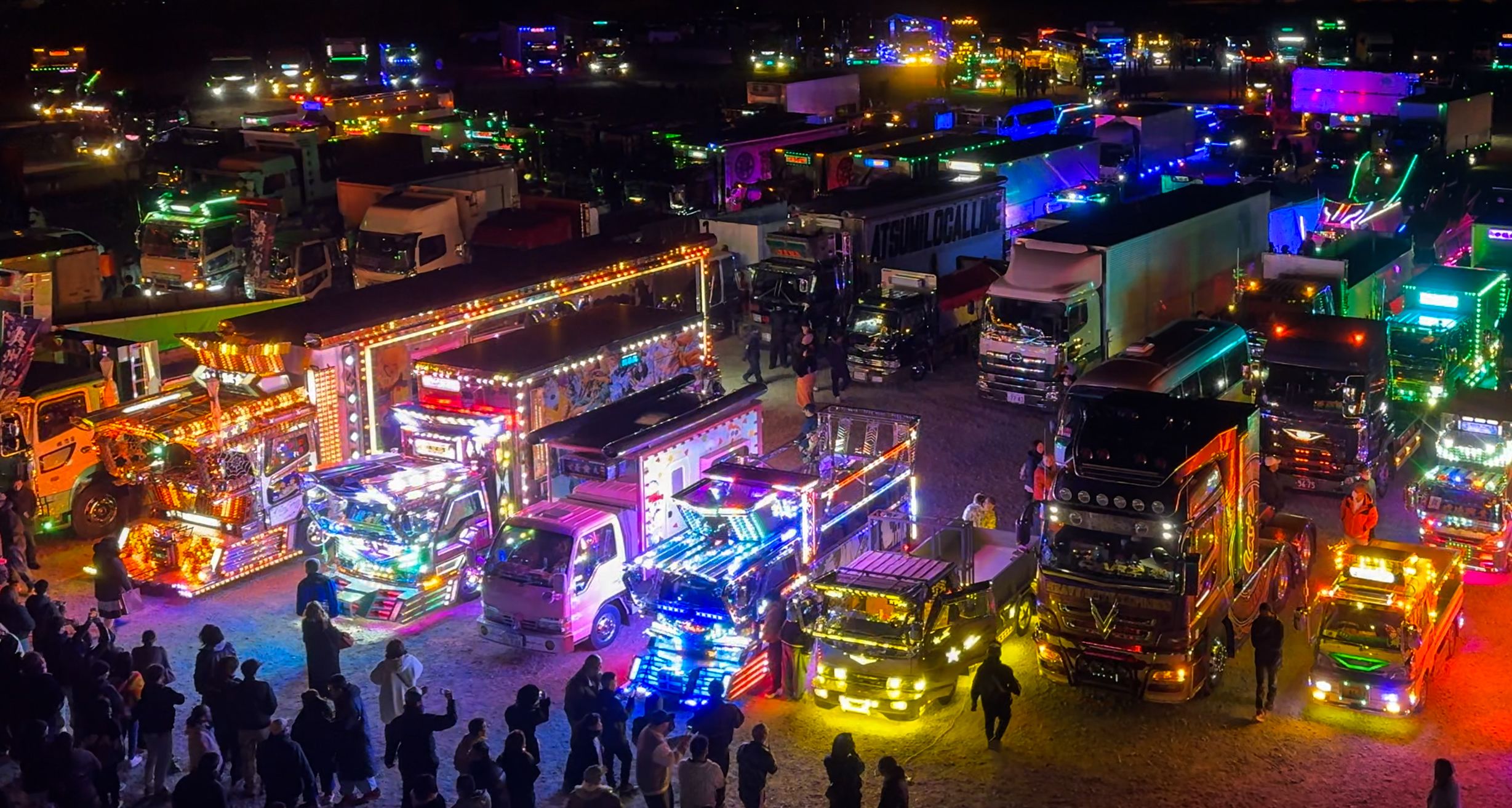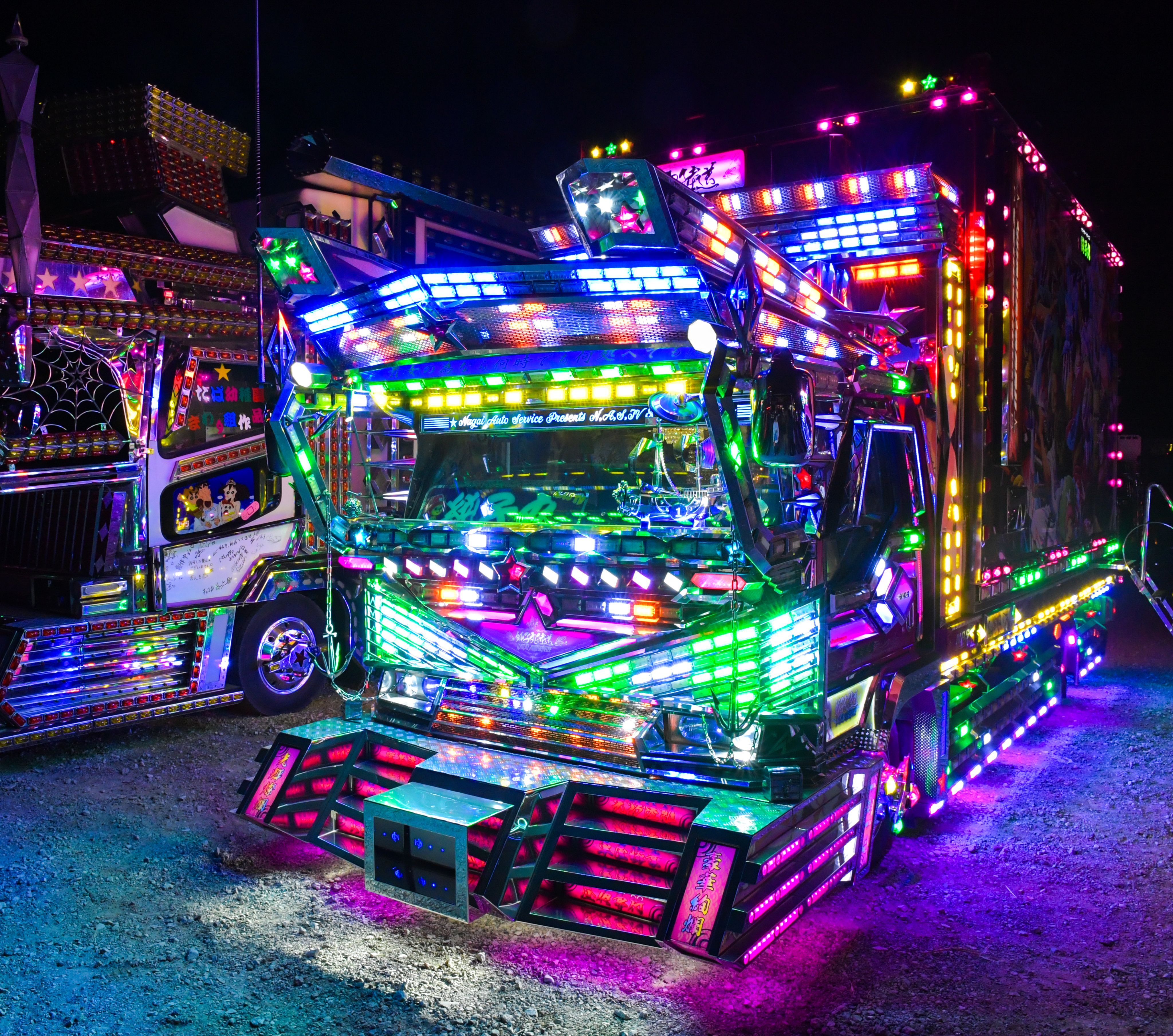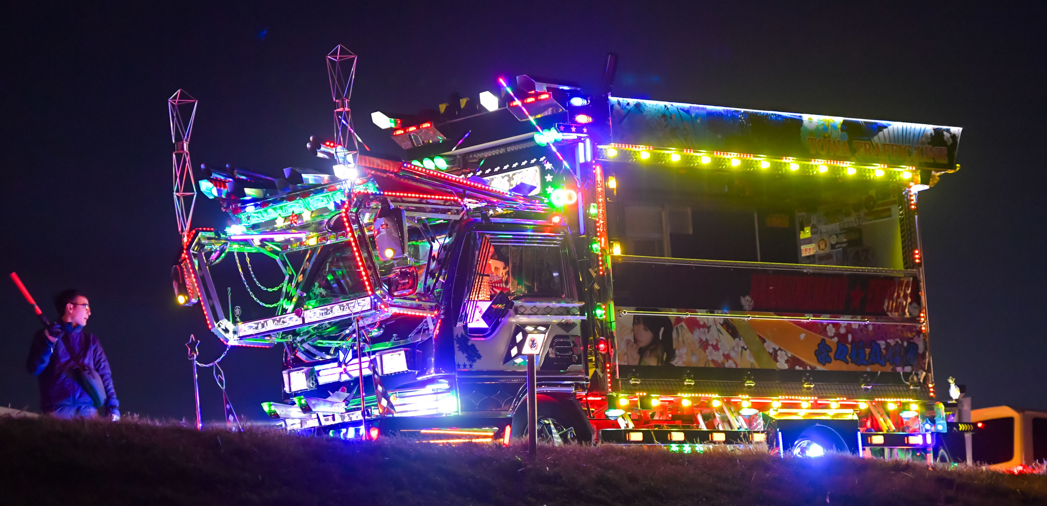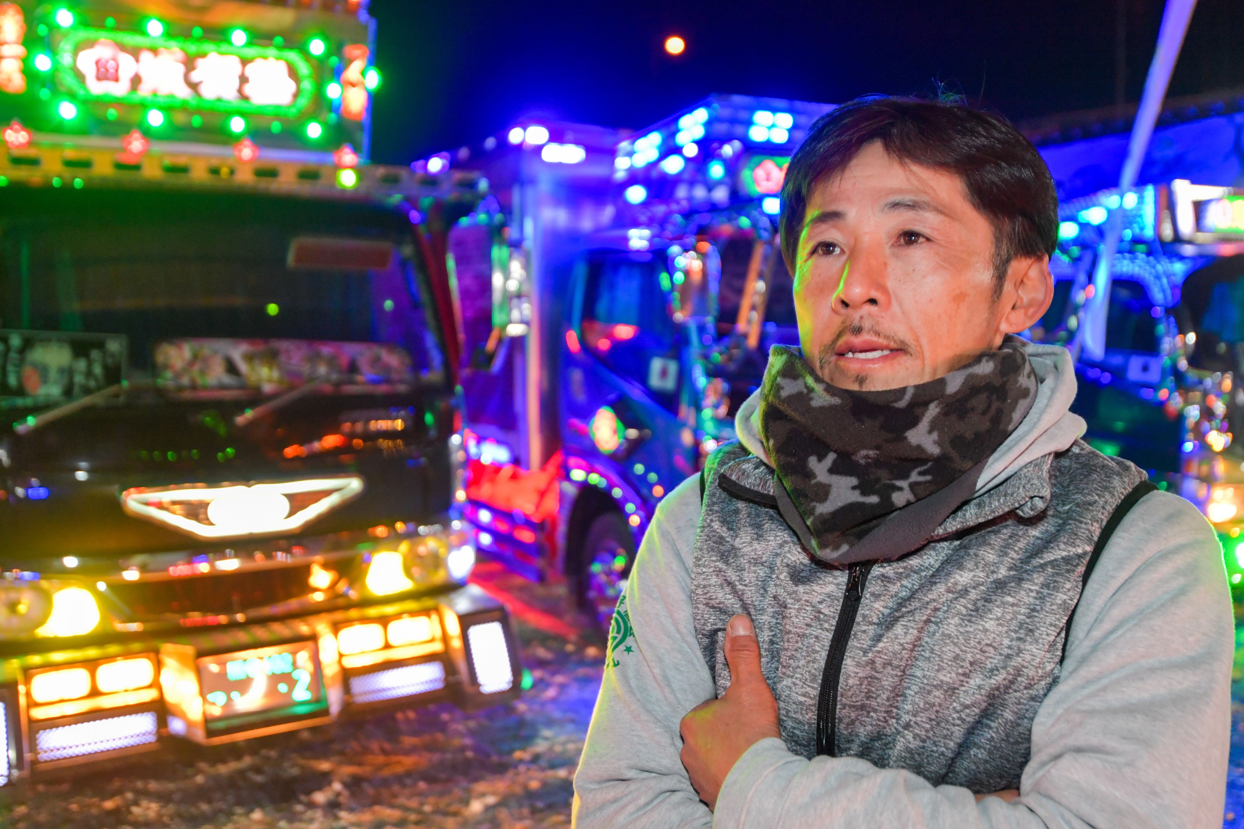 It was the country's largest assembly of decorated trucks, or "dekotora" as they are known in Japanese, which were fully illuminated in all their gaudy glory to the delight of thousands of attendees at a countdown event in Fukaya, Saitama Prefecture.