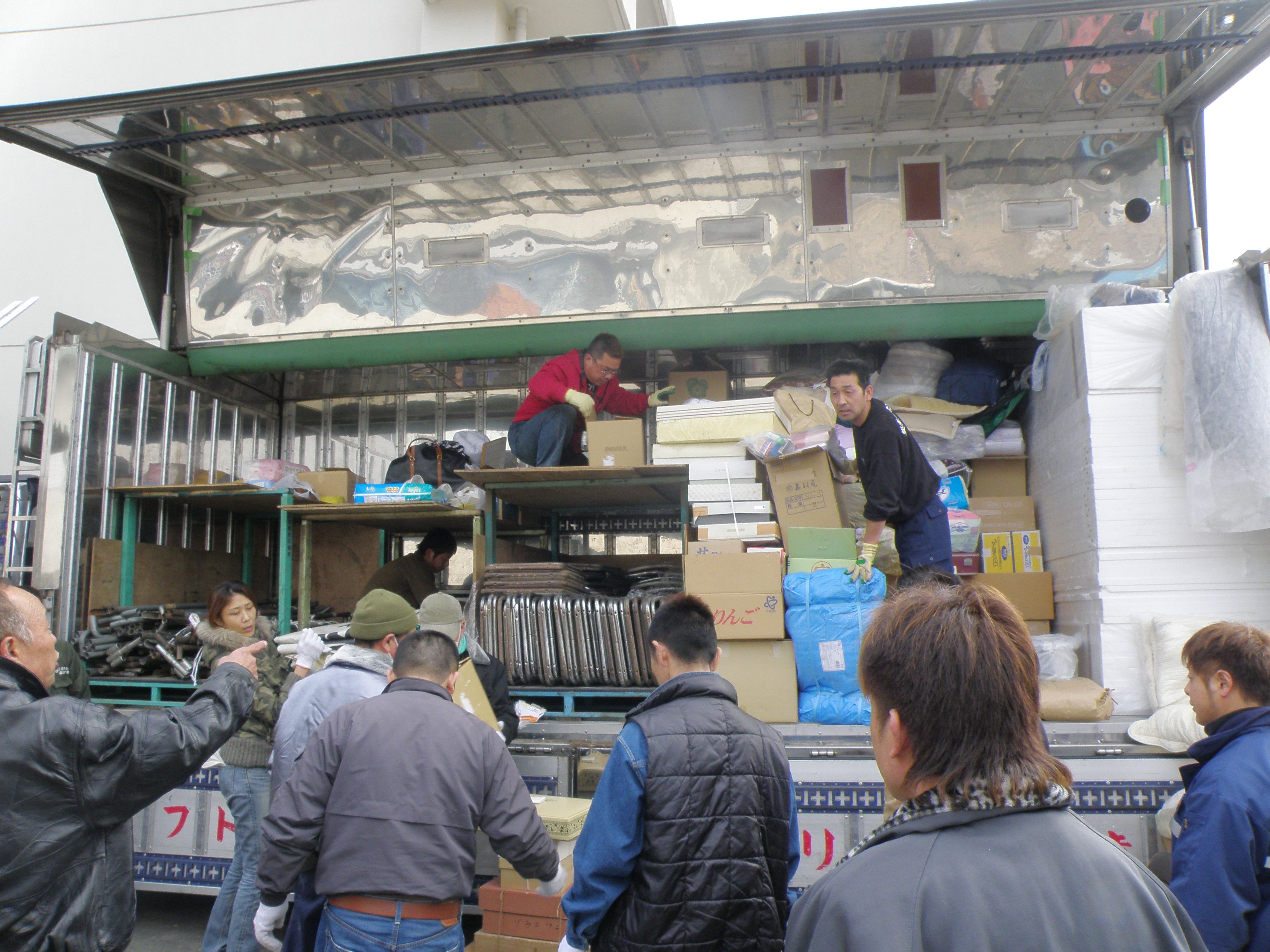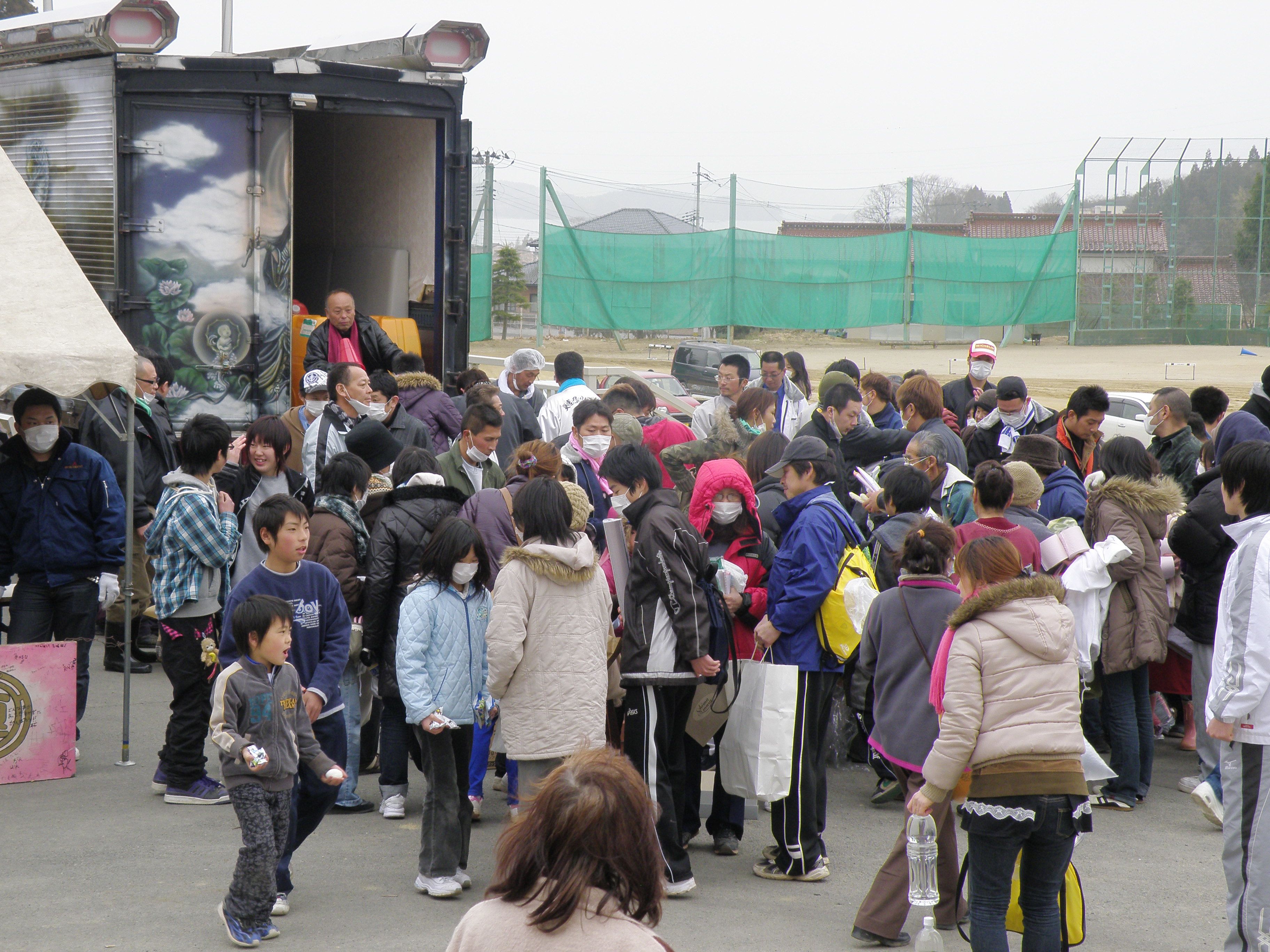 Members of Japanese decorated truck association Utamarokai hand out relief supplies at an evacuation center in Kesennuma, Miyagi Prefecture, on March 20, 2011, nine days after a powerful earthquake and tsunami hit the region. (Photo courtesy of Utamarokai)