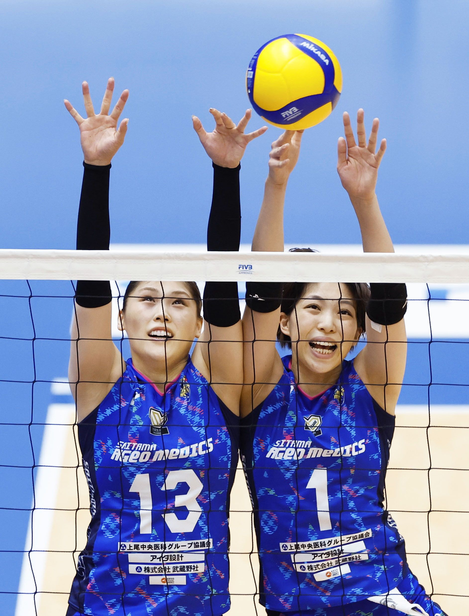 Ai Kurogo (L) and Hiroyo Yamanaka of Saitama Ageo Medics make a block in a women's volleyball SV.League game against NEC Red Rockets Kawasaki at Kawasaki's Todoroki Arena on Oct. 12, 2024. (Kyodo/Masanori Kumagai)