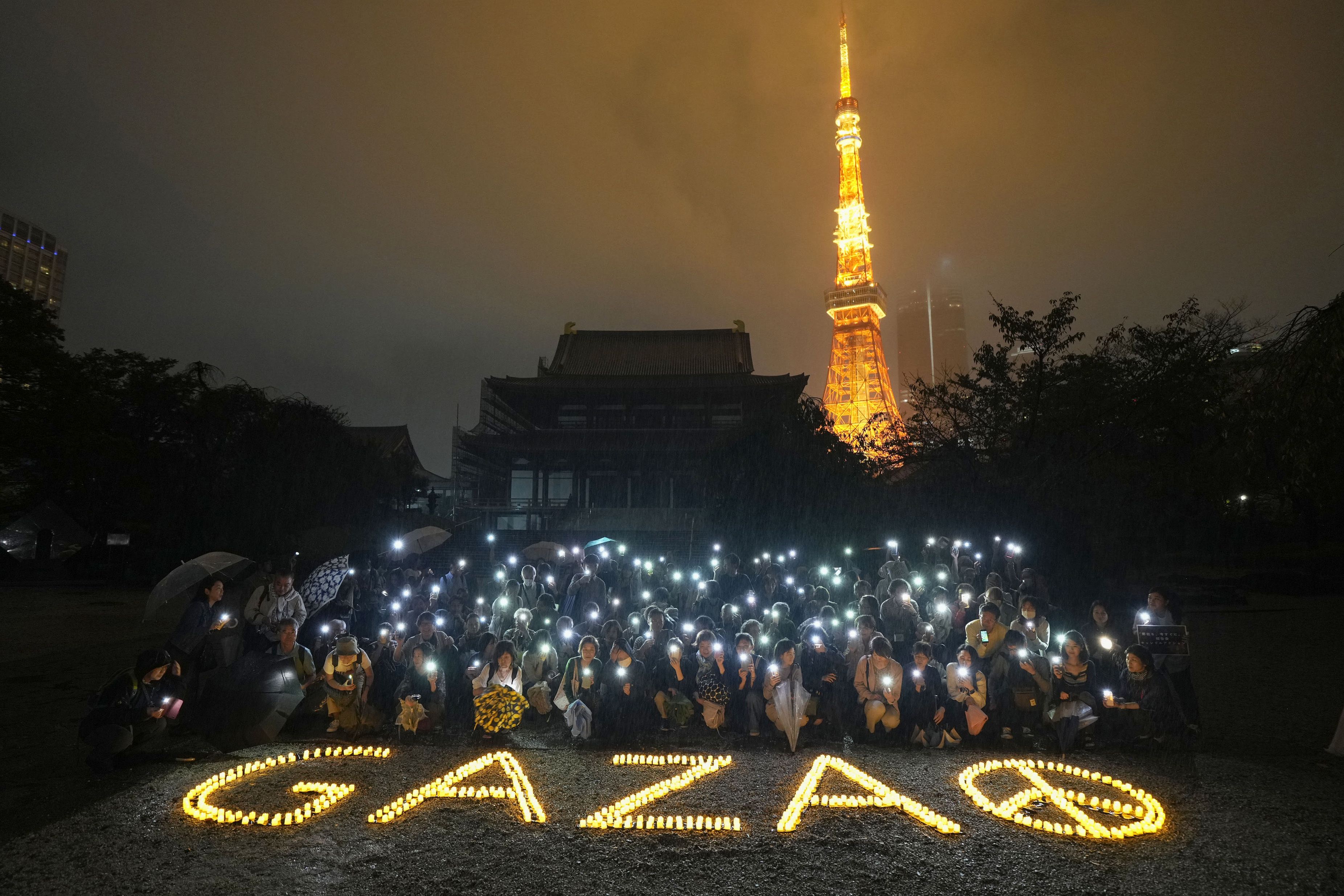 People light up their smartphones at Zojoji temple in Tokyo on Oct. 5, 2024, for victims of Israel's assault on Gaza. (Kyodo/Takaki Yajima)