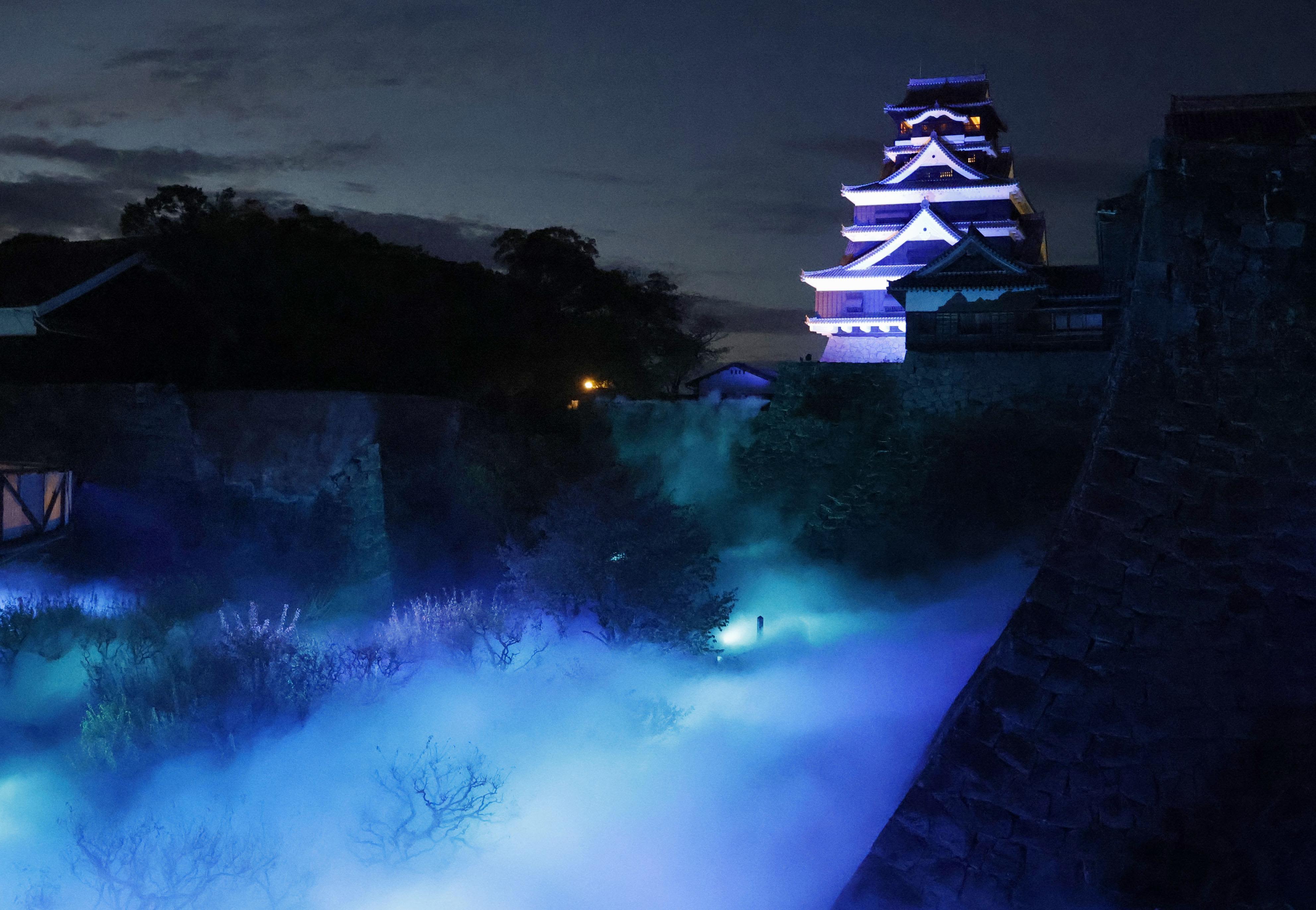 Kumamoto Castle, a popular tourist destination in southwestern Japan, appears to be floating in a sea of clouds on Oct. 9, 2024, as artificial mist emerges around the steeply curving stone walls of the castle's main tower for a limited-time event. (Kyodo/Tamao Ichikawa)