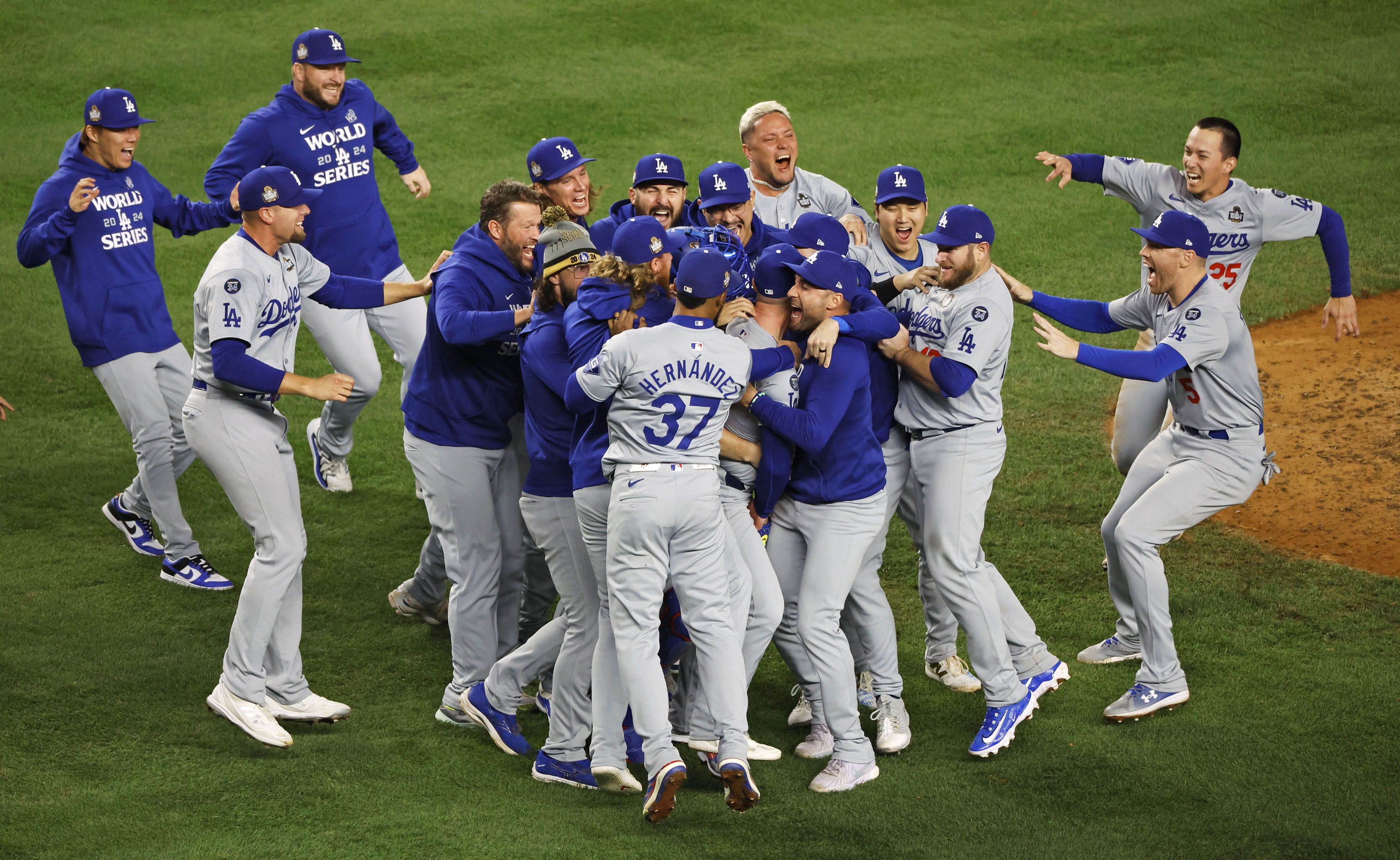Los Angeles Dodgers players celebrate after clinching the MLB World Series with a 7-6 win over the New York Yankees in Game 5 on Oct. 30, 2024, at Yankee Stadium in New York. (Kyodo/Kotaro Ohashi)