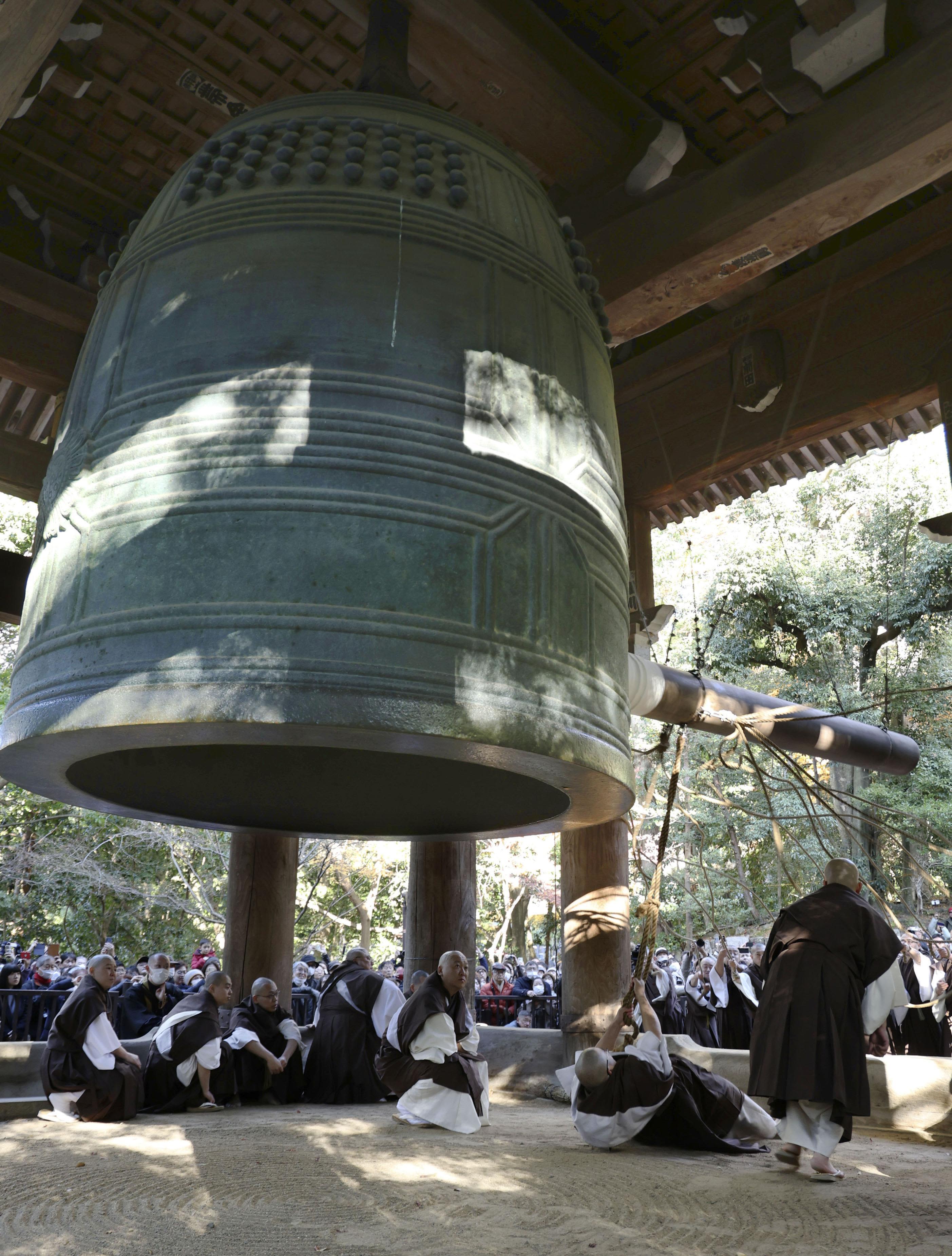 A giant bell is rung by monks at Chion-in temple in Kyoto on Dec. 27, 2024, in a rehearsal for a bell-ringing ceremony on New Year's Eve. (Kyodo/Nana Yumura)
