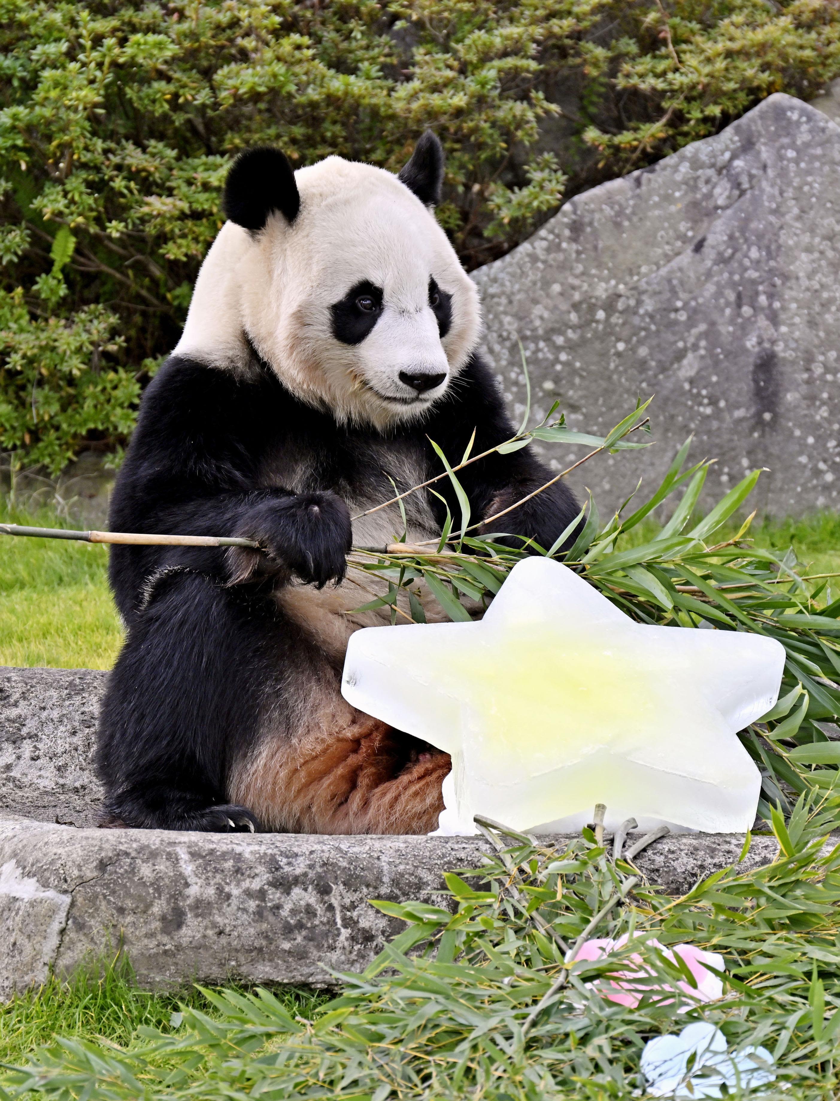 Giant panda Fuhin is given a star-shaped ice block as a Christmas gift at the Adventure World zoo and amusement park in Shirahama in the western Japan prefecture of Wakayama on Dec. 24, 2024. (Kyodo/Machiko Nasu)