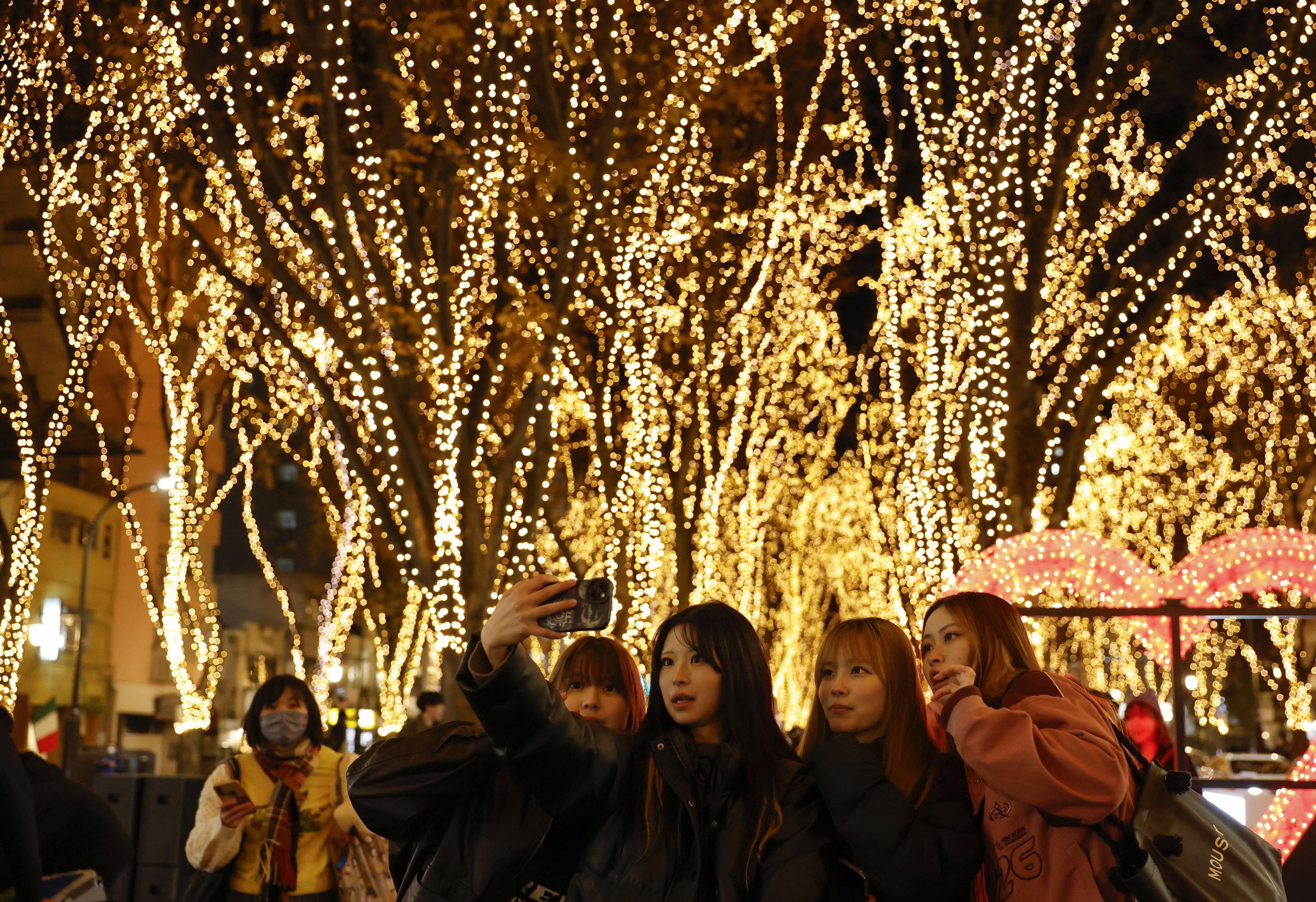 The annual Sendai Pageant of Starlight illumination event kicks off in Sendai, northeastern Japan, on Dec. 6, 2024, with about 1.6 million visitors expected through Dec. 25. Zelkova trees lining a 450-meter street are lit up with about 450,000 LED lights. (Kyodo/Miyuki Saito)