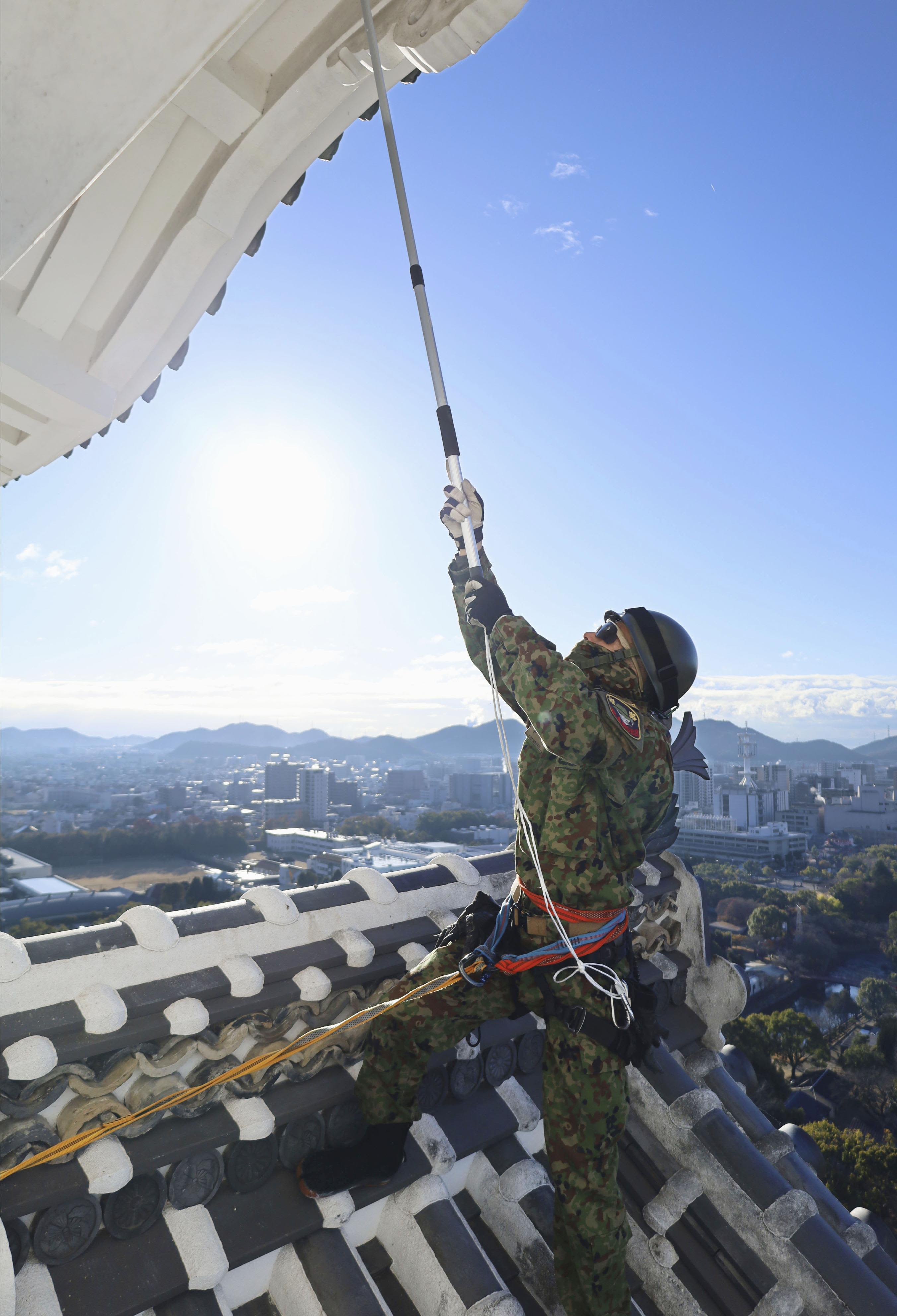A Japan Ground Self-Defense Force member cleans the World Heritage-listed Himeji Castle in Himeji in Hyogo Prefecture, western Japan, on Dec. 19, 2024, ahead of the New Year. (Kyodo/Mayu Iwasaki)