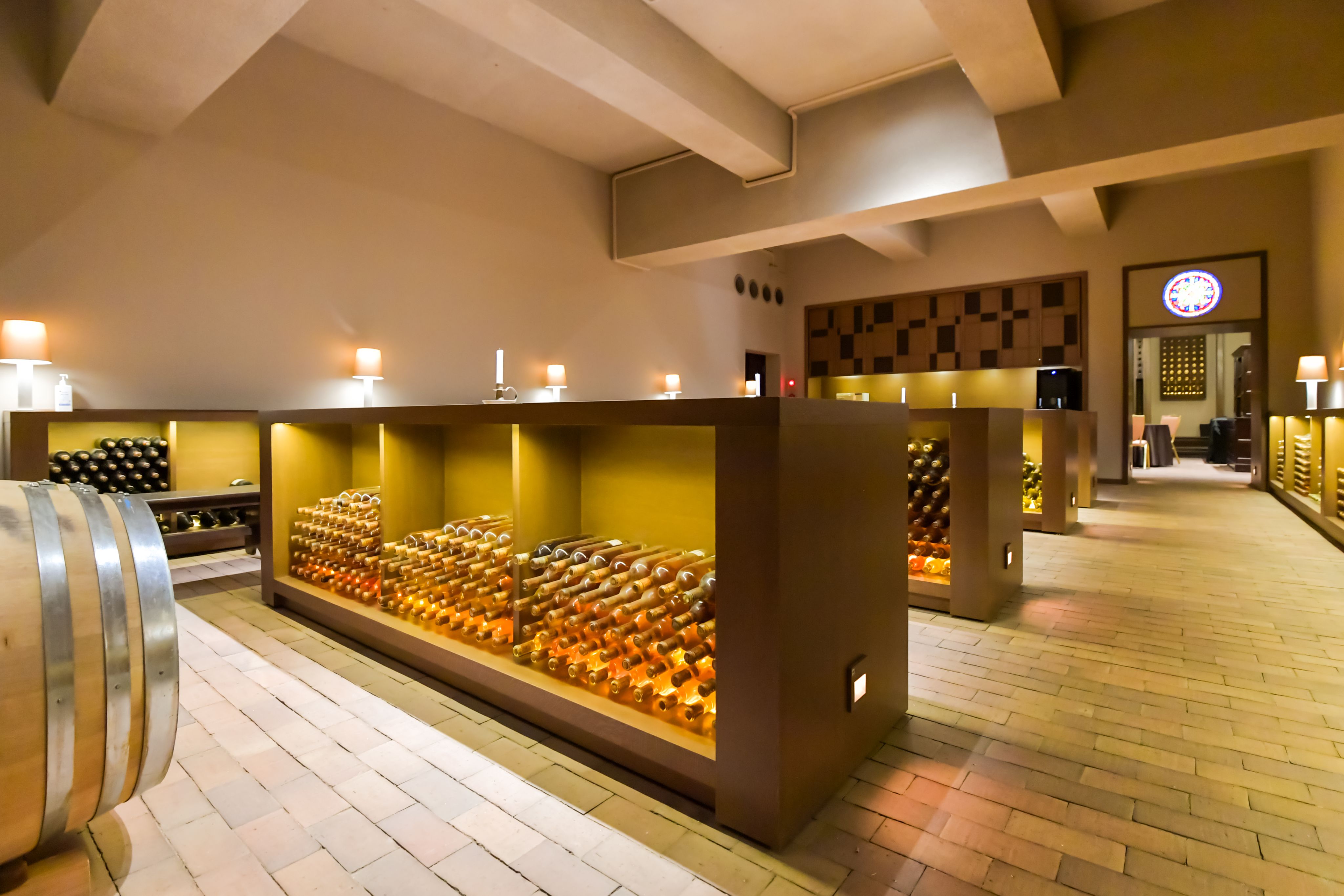 On the fringes of the garden, the wine cellar is opened for winery tours and VIPs. A shop and tasting counter overlook the valley.