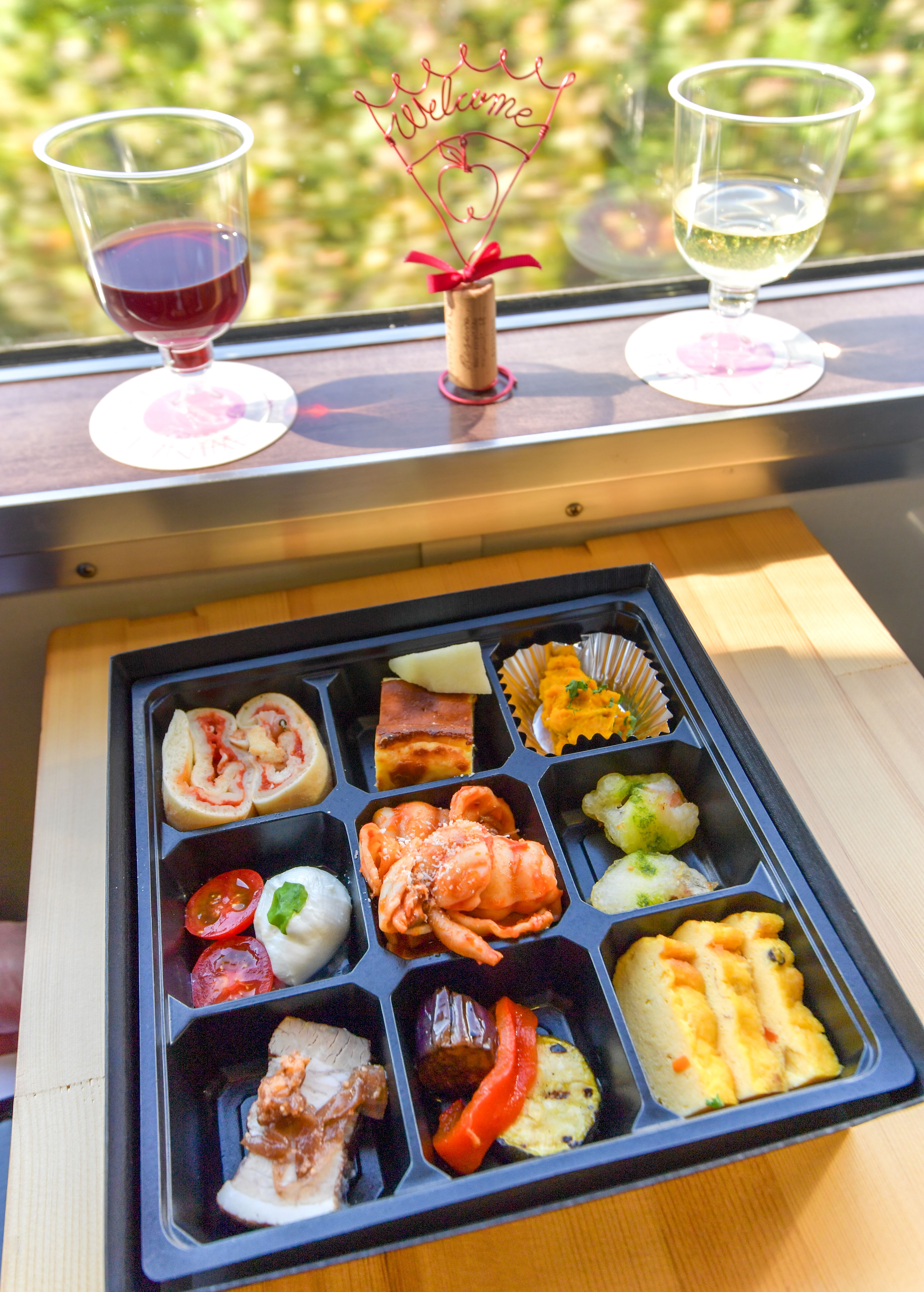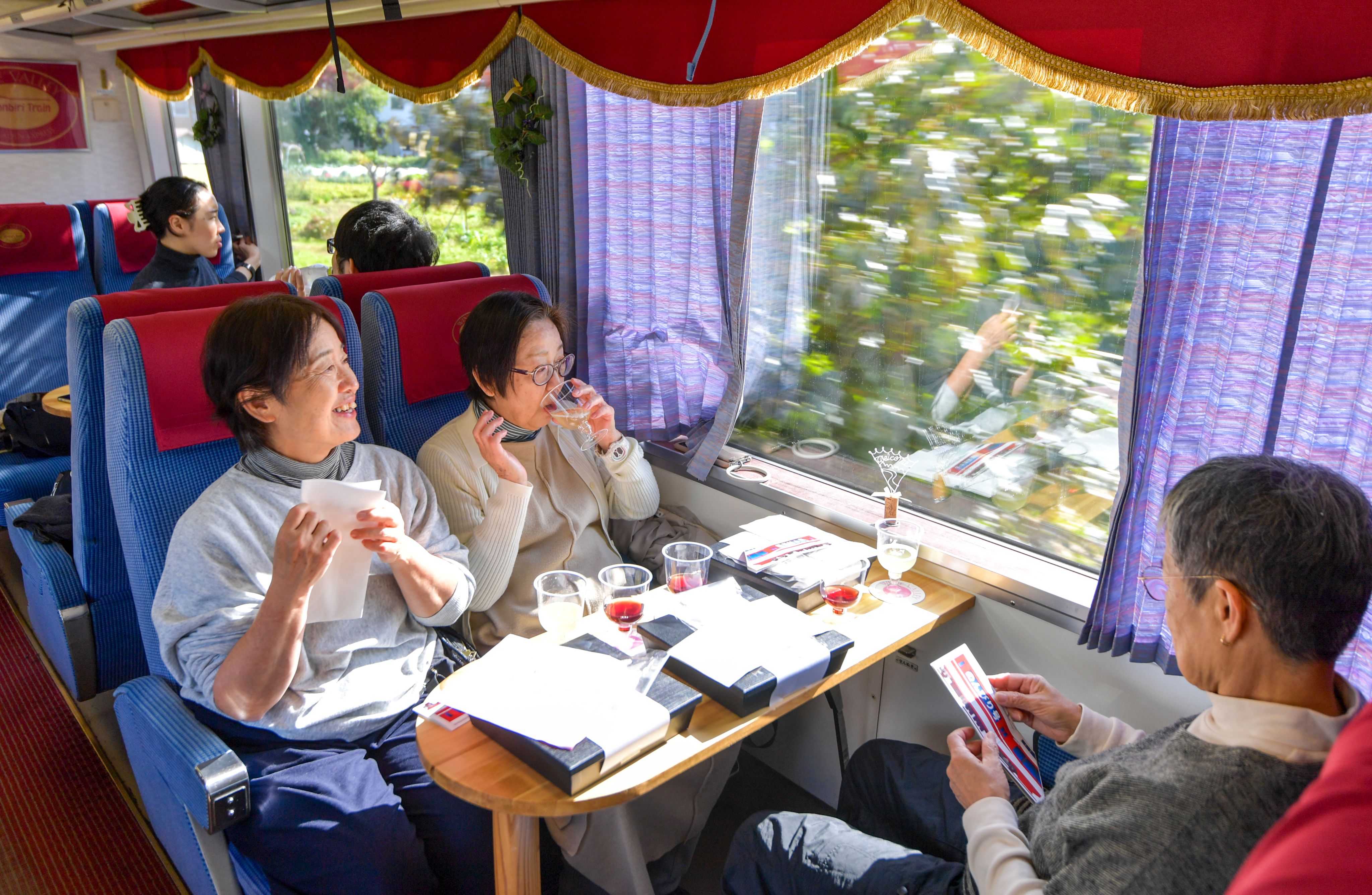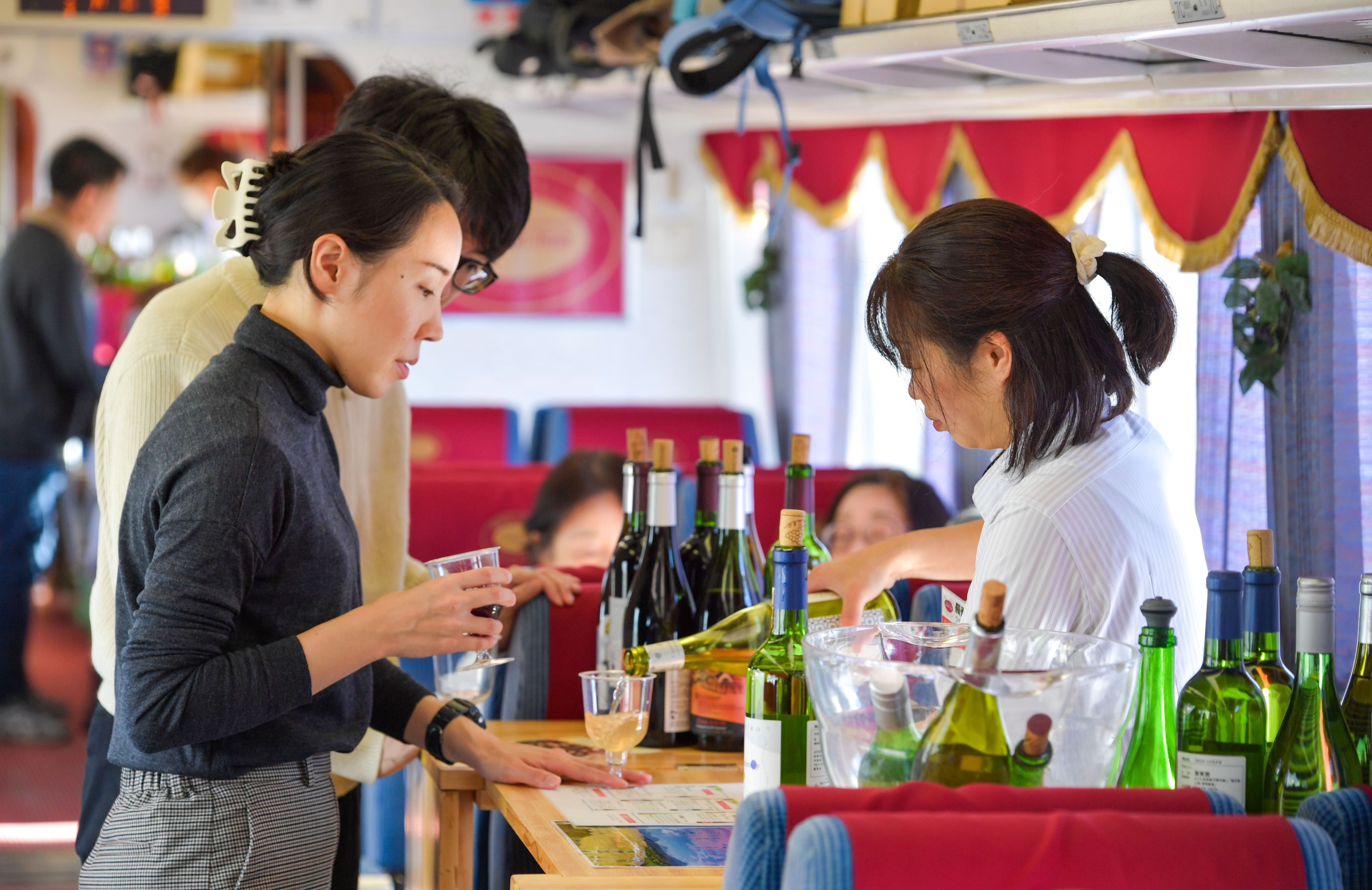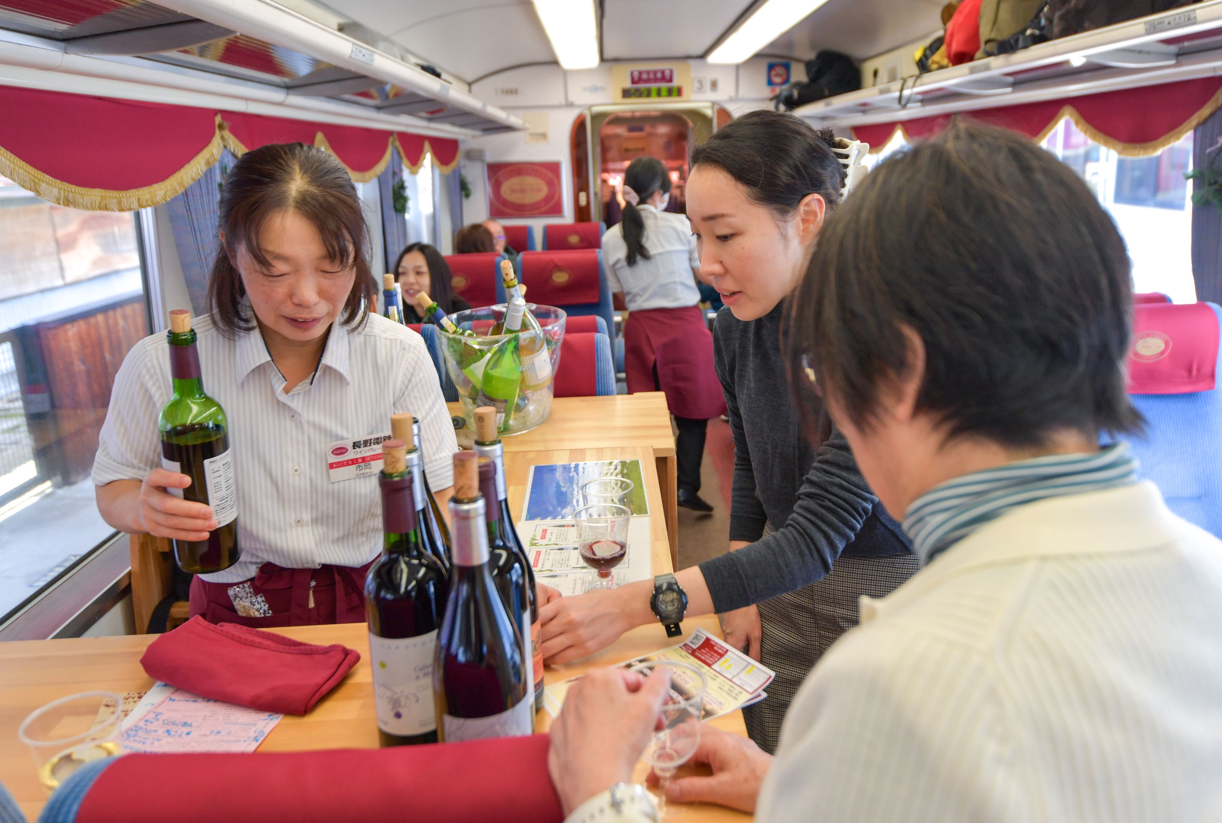 On a wine valley train departing Yudanaka in early November, passengers choose from the selection of wines at a counter in the middle of the carriage, taking care to keep glasses steady as they return to their seats on the moving train.
