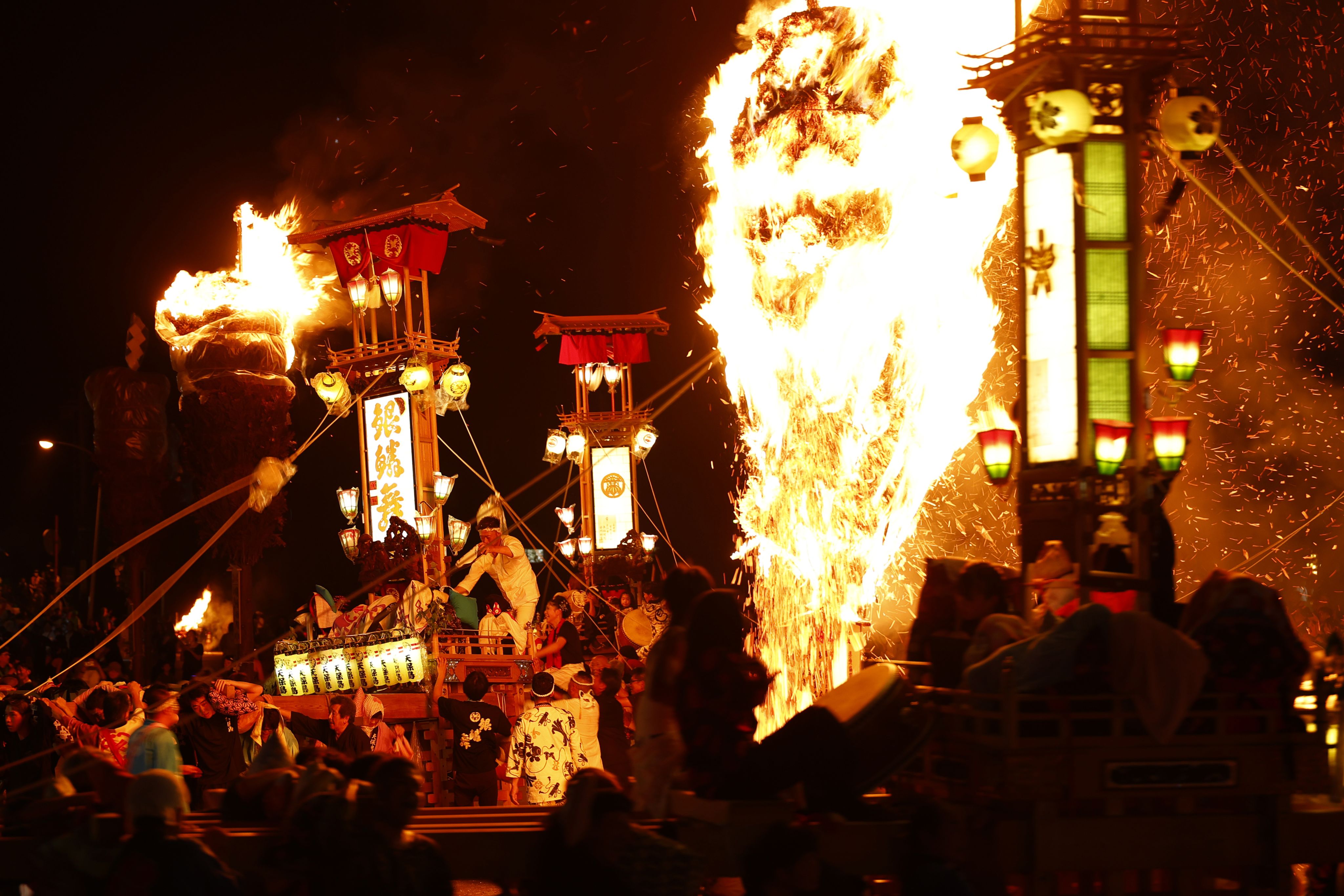 在火把映照下,巨型灯笼“奉灯”狂舞。2025年7月摄于石川县能登町。