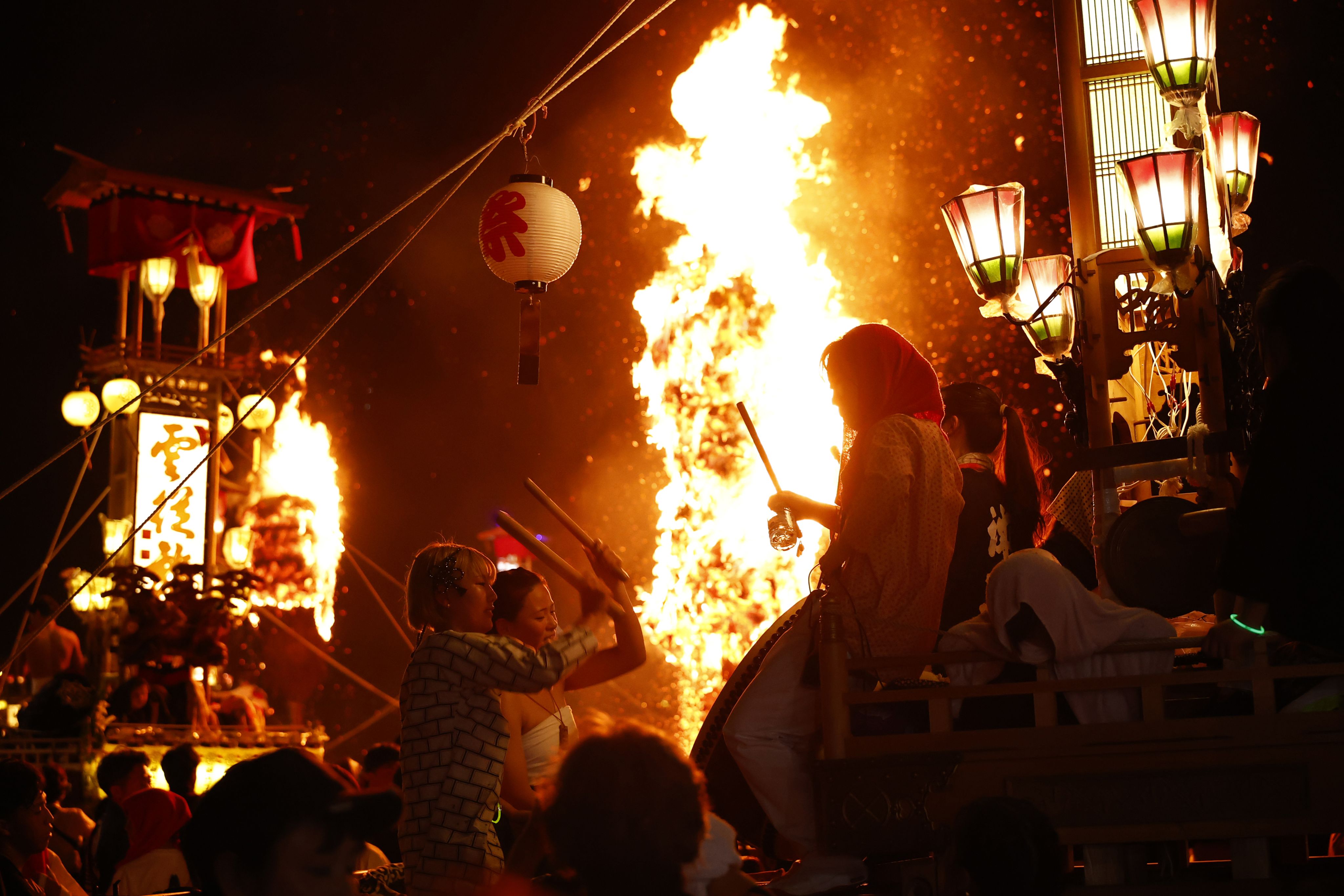 在火把映照下,巨型燈籠「奉燈」狂舞。2025年7月攝於石川縣能登町。