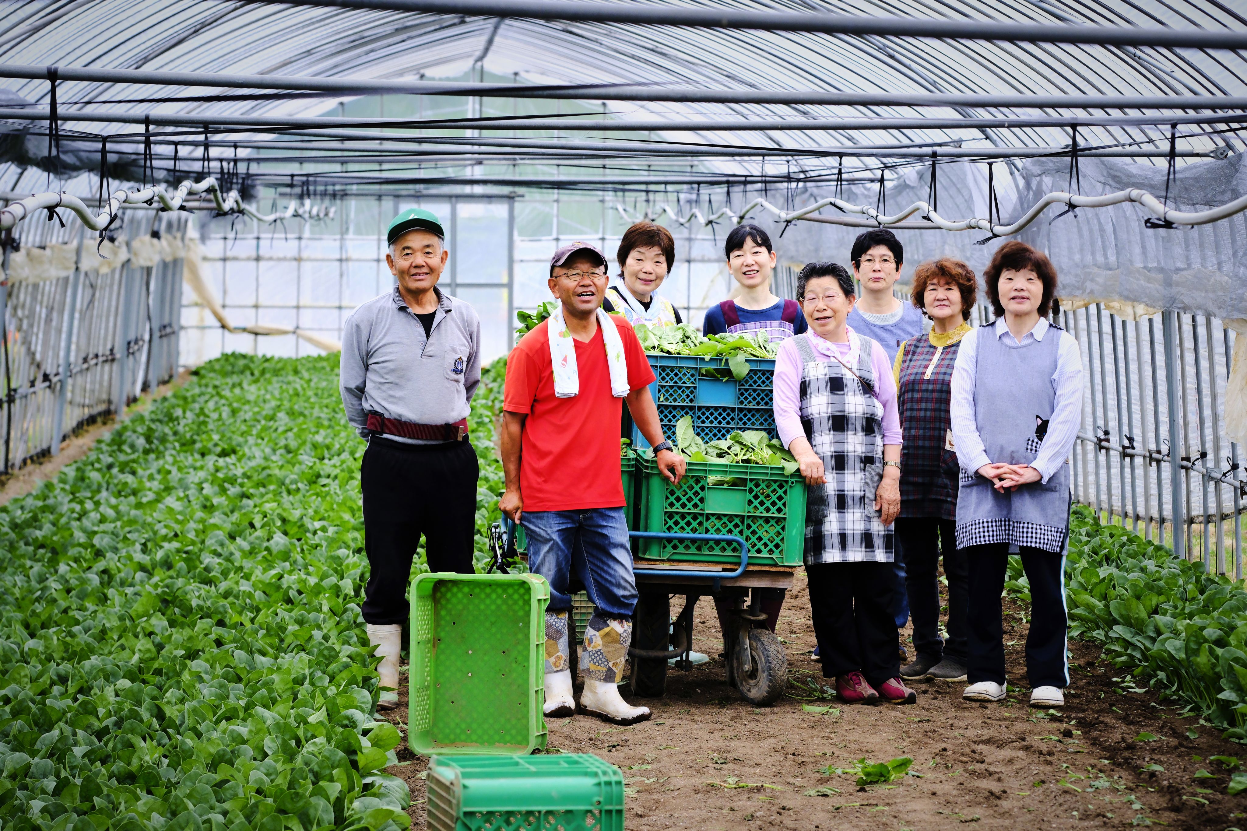 池口千代枝(右四)在種植大棚內與家人和員工合影。2025年6月攝於石川縣輪島市町野町。