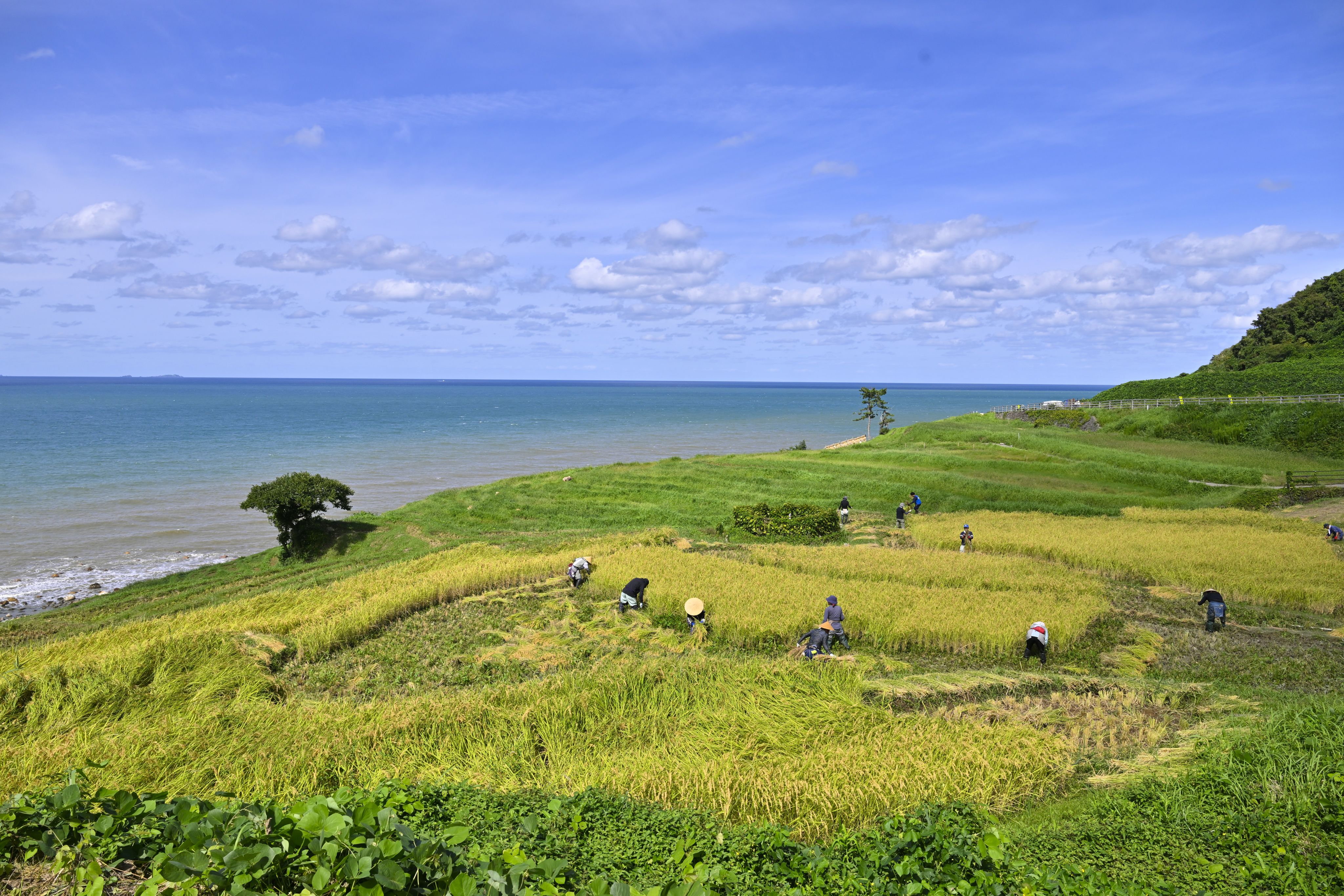 秋收時節,石川縣輪島市的著名景觀「白米千枚田」一派繁忙景象。當地從能登半島地震與創紀錄的暴雨災害中走出,一步步向前邁進。