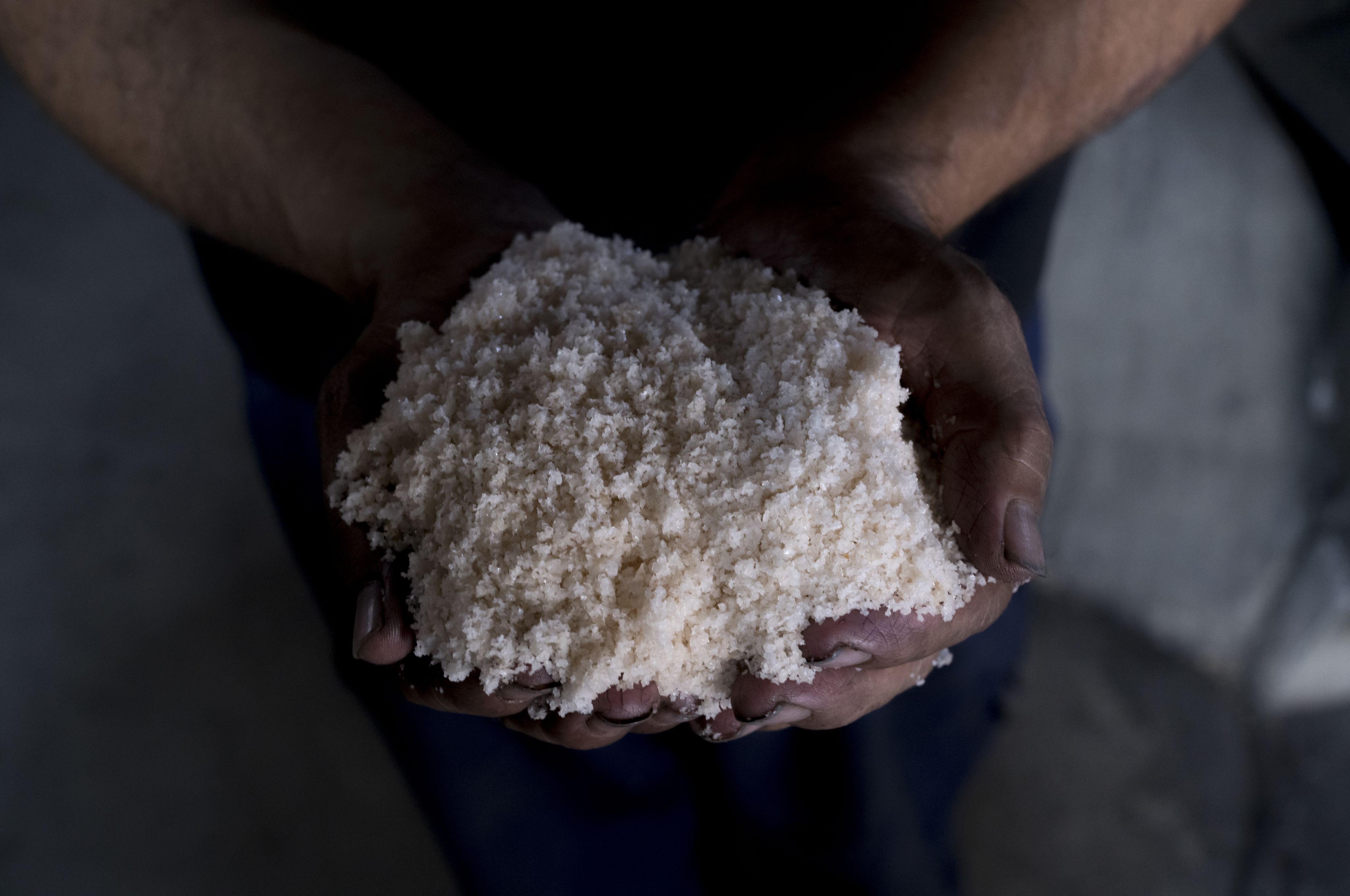 這是延續了四百多年的「揚濱式」制鹽法:把海水灑到沙地的鹽田上,自然風乾之後用大鍋熬煮濃縮。其特點是鹽的顆粒較粗,口感微甜。