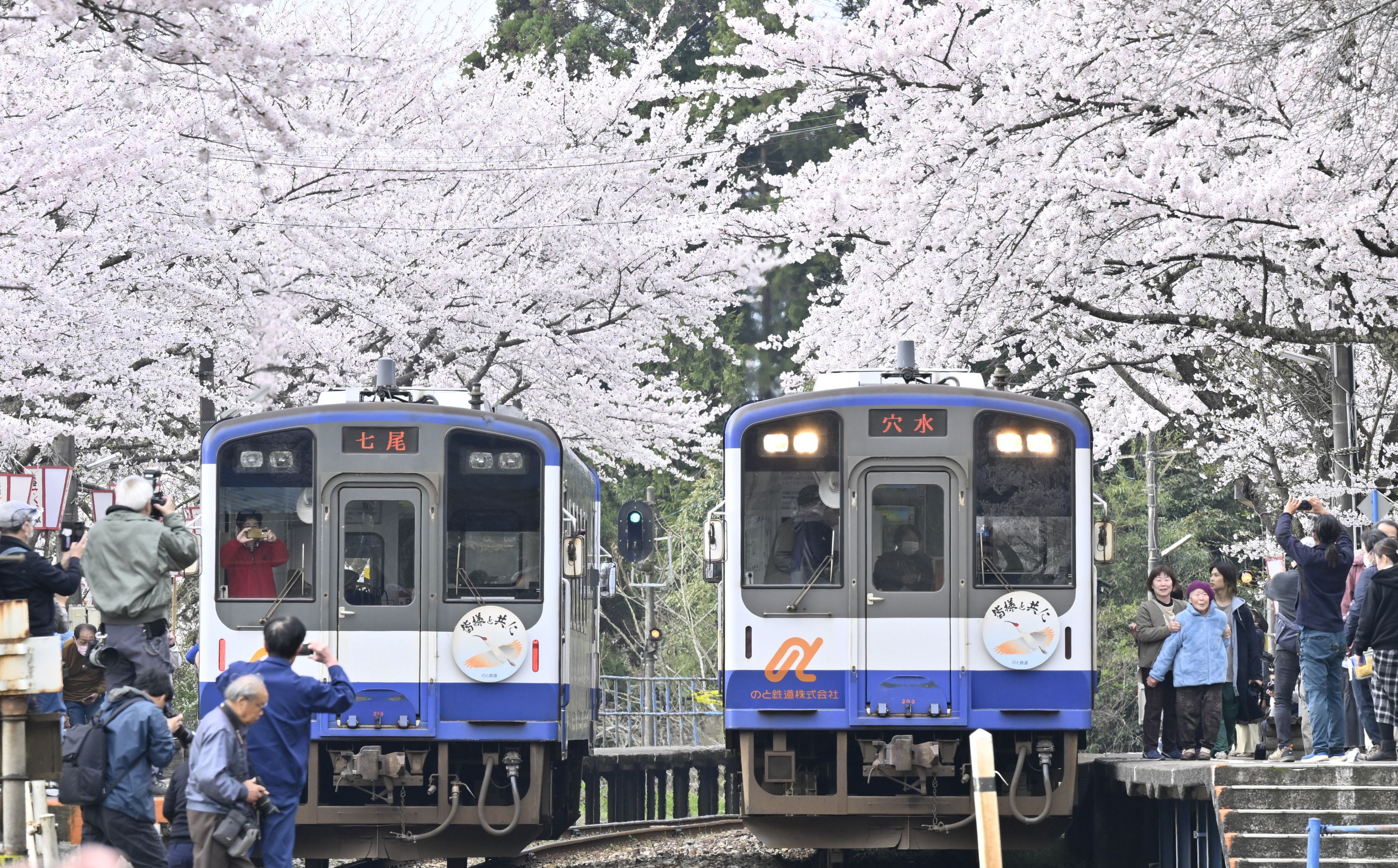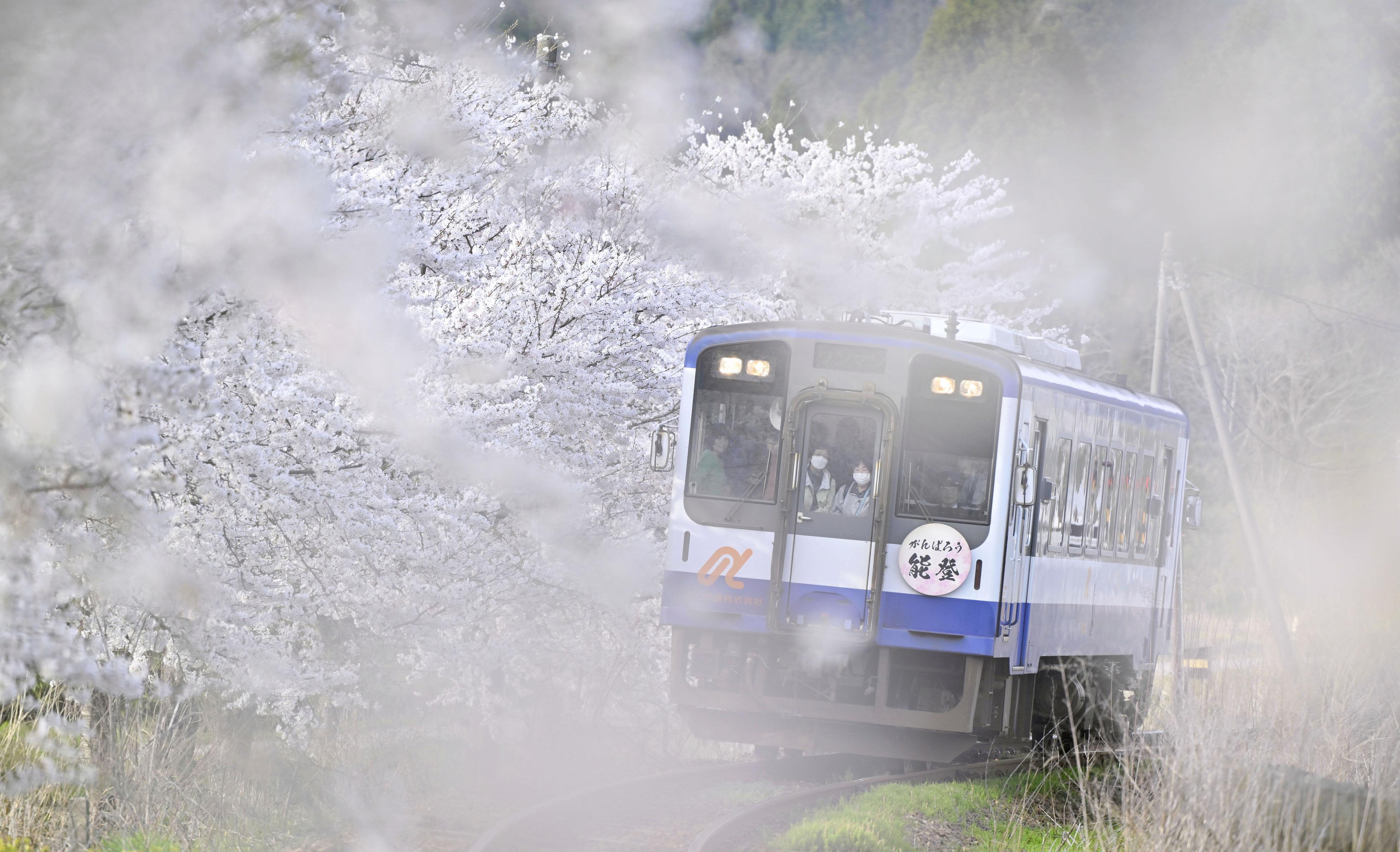地震導致泥沙流入隧道,能登鐵道不得不停運,歷時三個月才全面恢復運行。作為居民出行的重要交通工具,該鐵道支撐著災後重建。沿線競相綻放的櫻花與列車交織的景觀是當地的瑰寶。