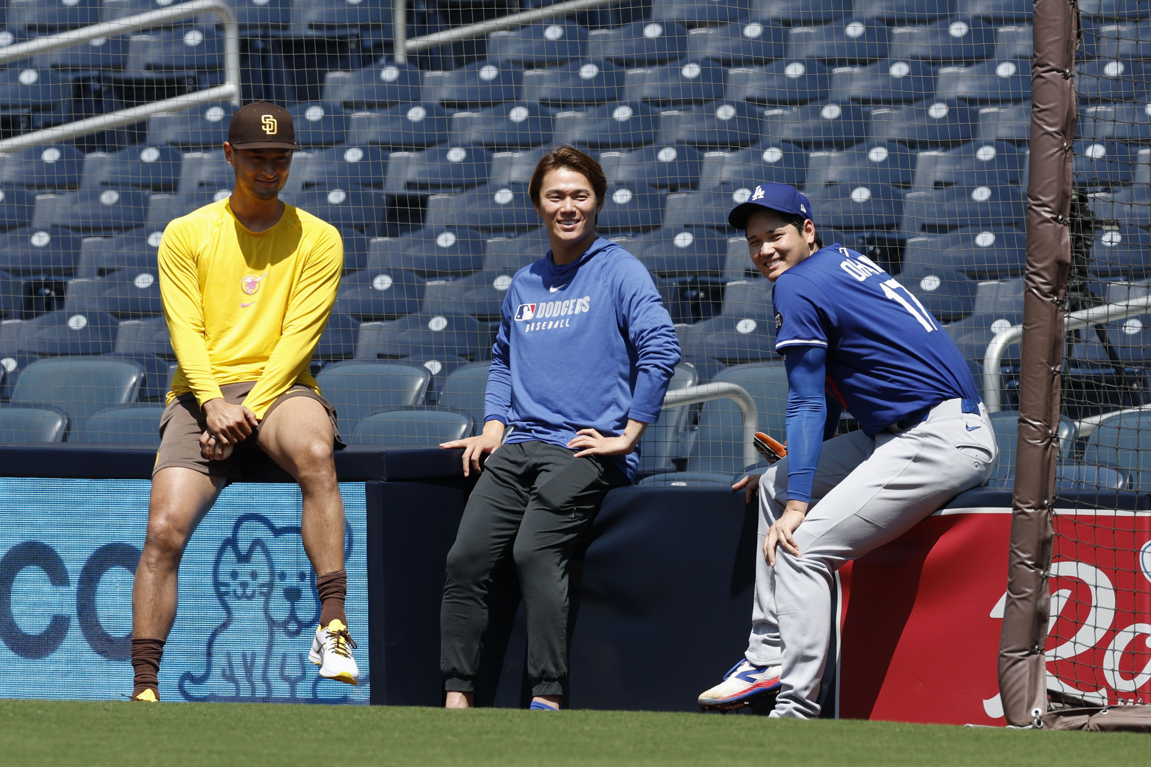 2025年6月10日,聖地牙哥教士隊達比修有、道奇隊山本、大谷在賽前談笑。(共同社)