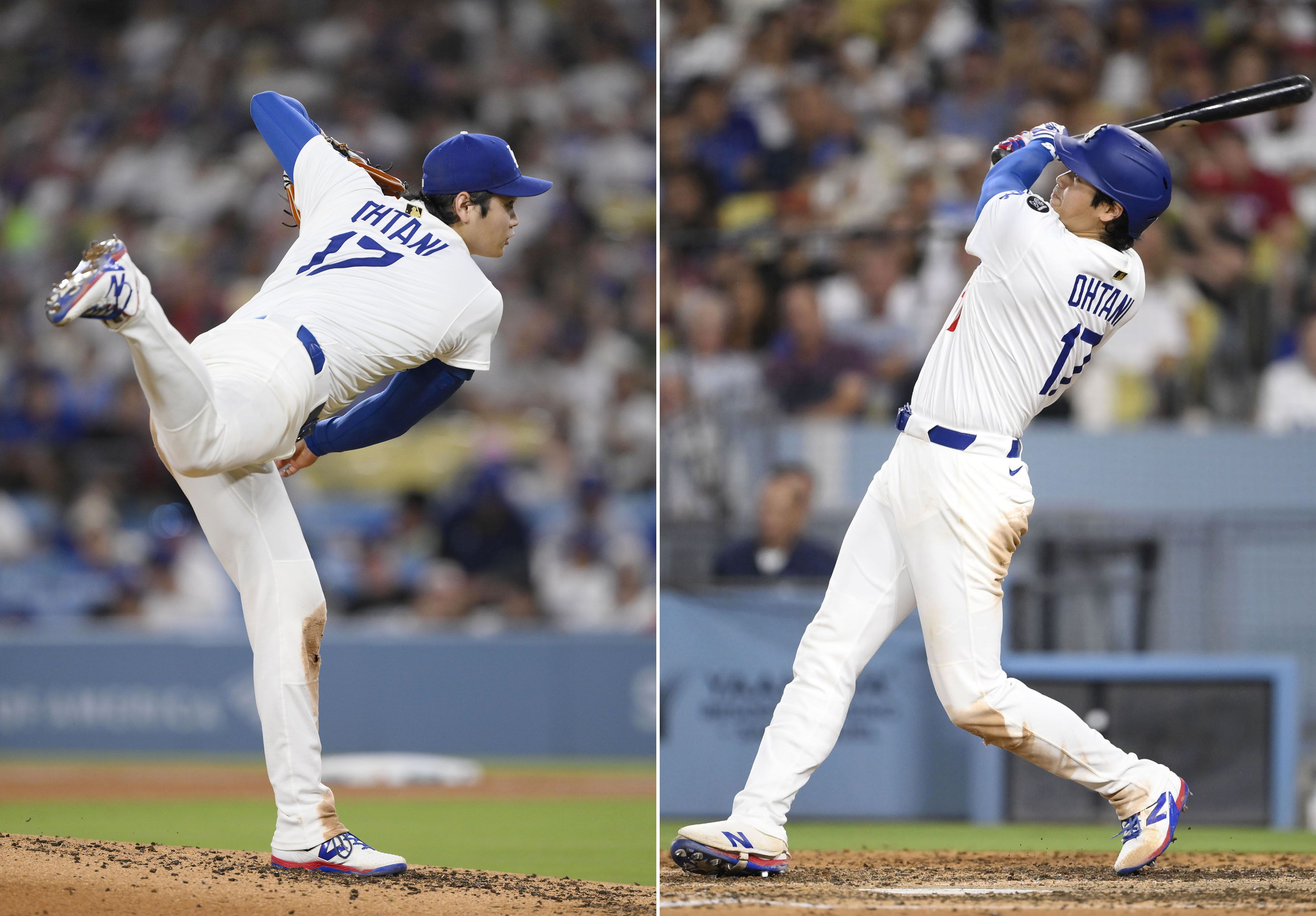 這是大谷在對陣小熊隊時轟出賽季首支全壘打的合成照片。2025年3月19日攝於東京巨蛋。(共同社)