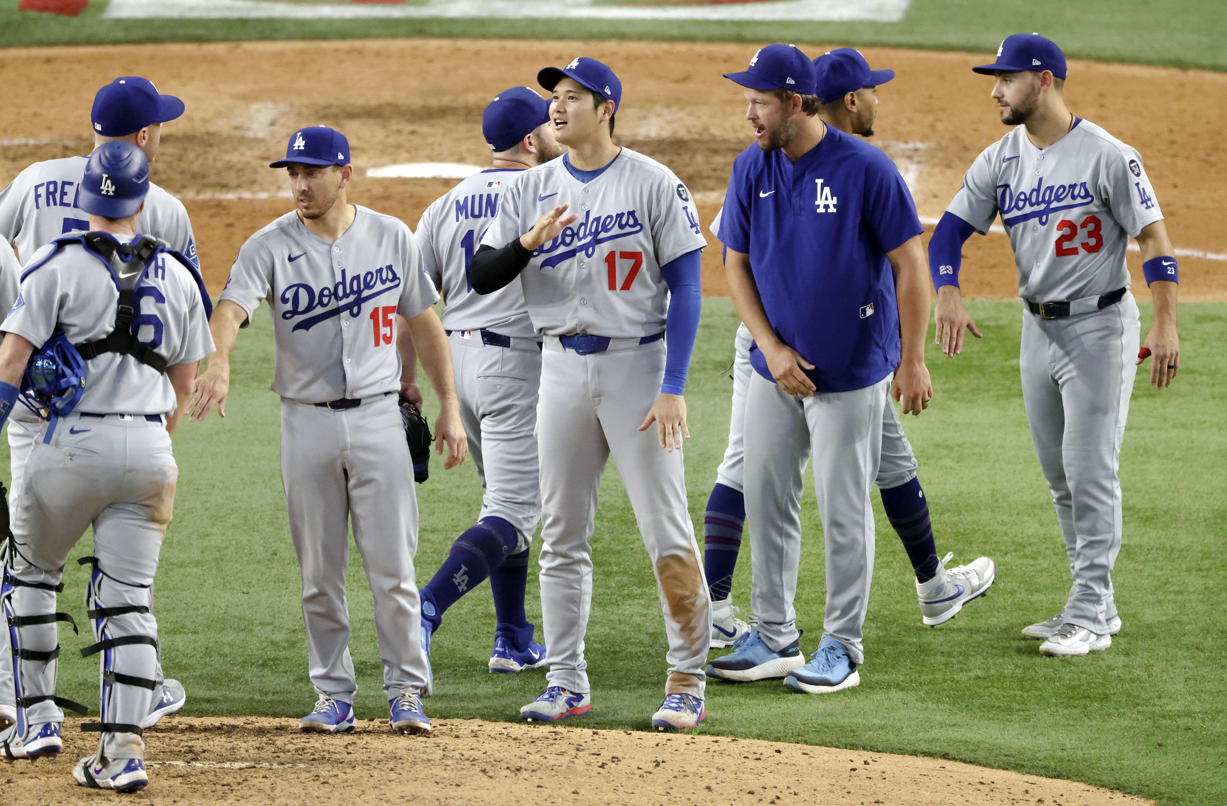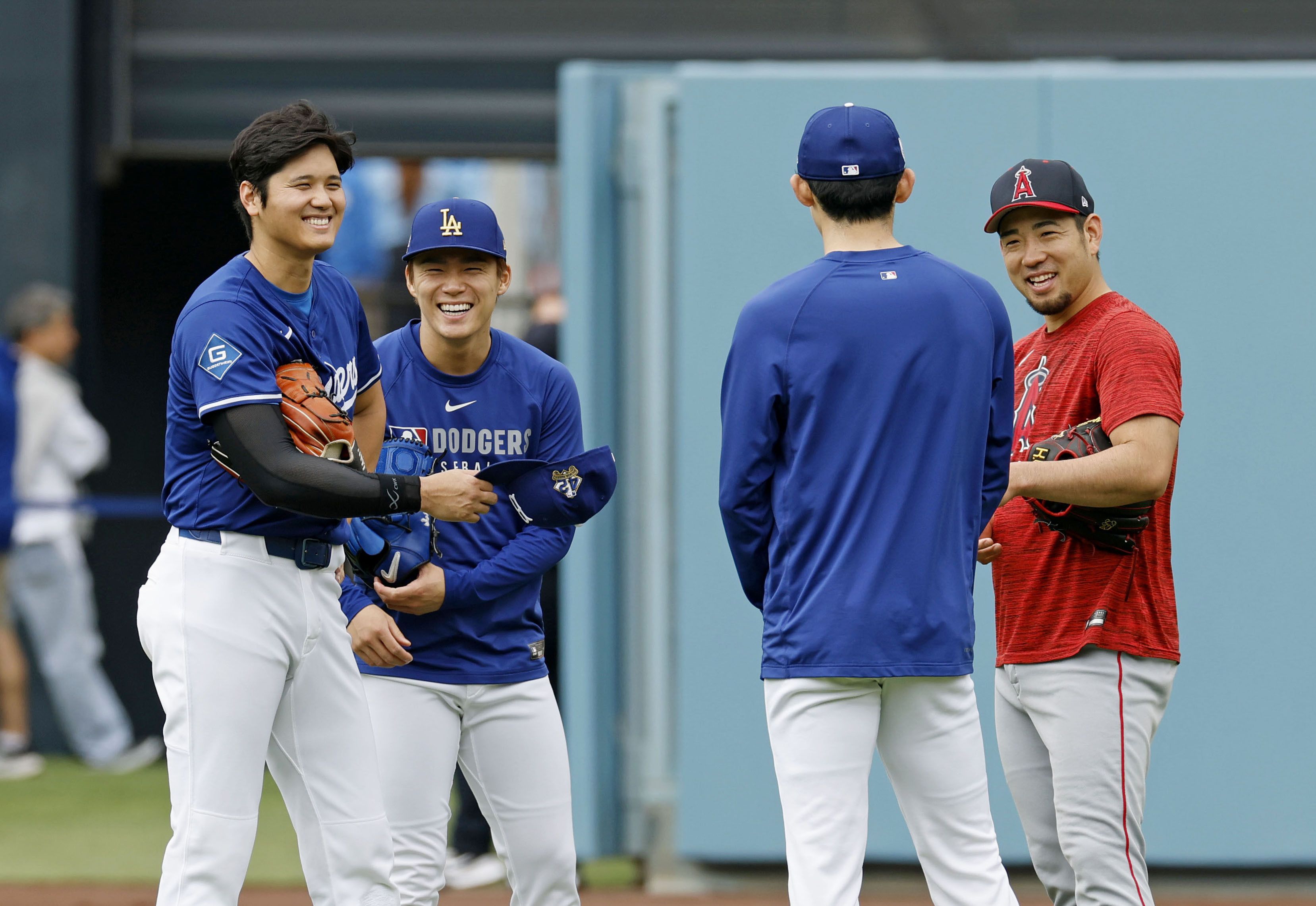 2025年5月17日,道奇隊大谷、山本、佐佐木、洛杉磯天使隊菊池雄星在賽前談笑。(共同社)