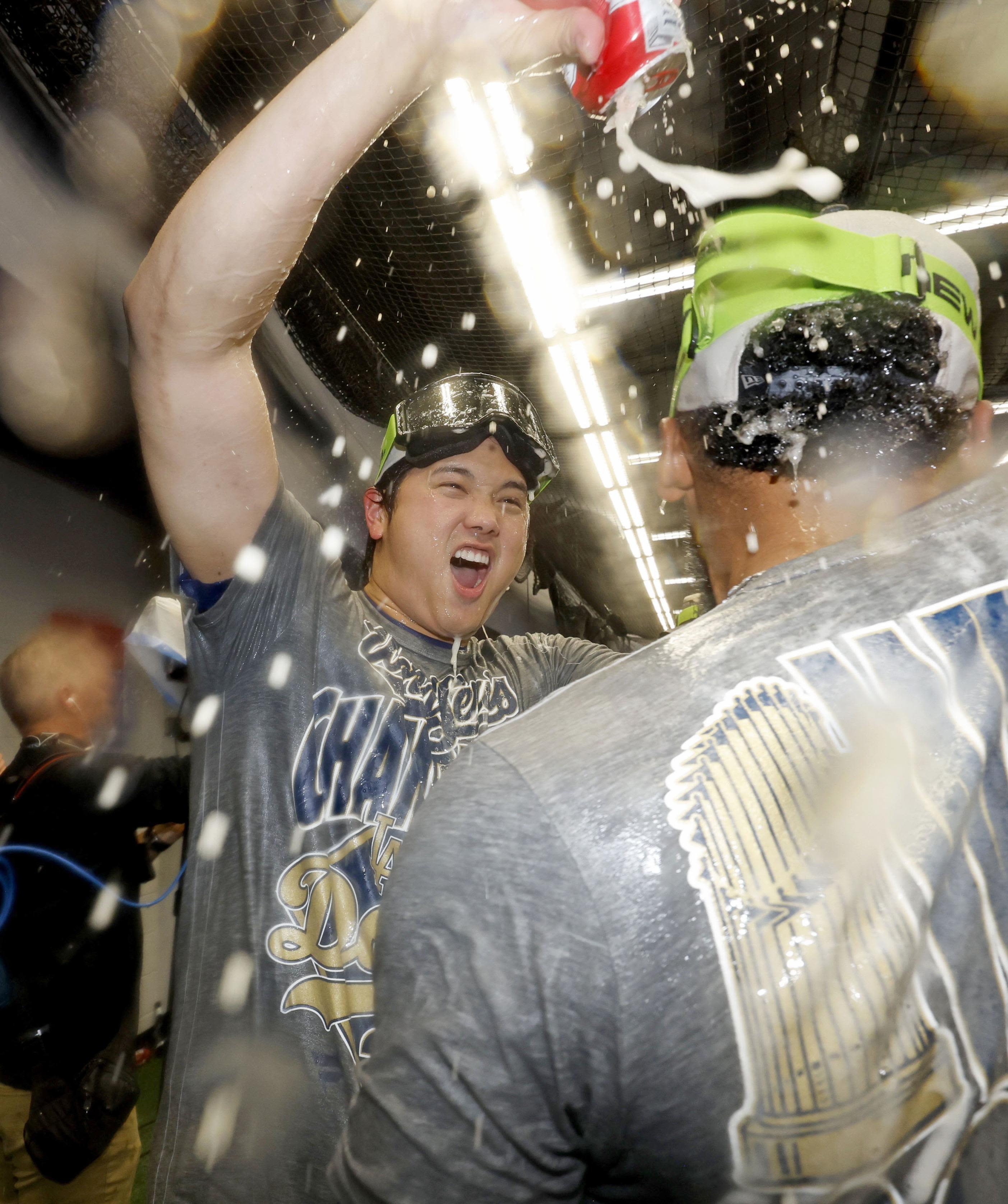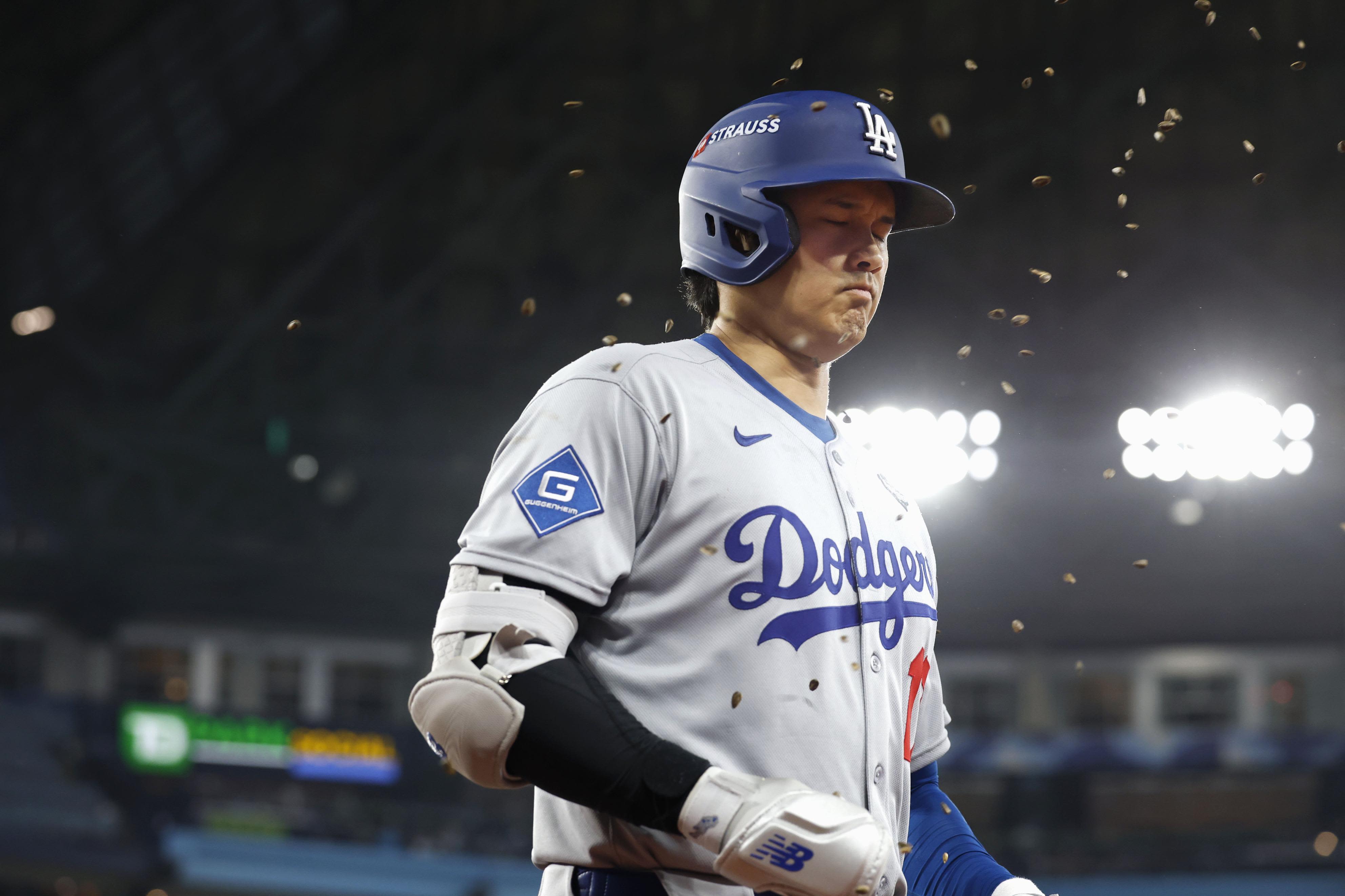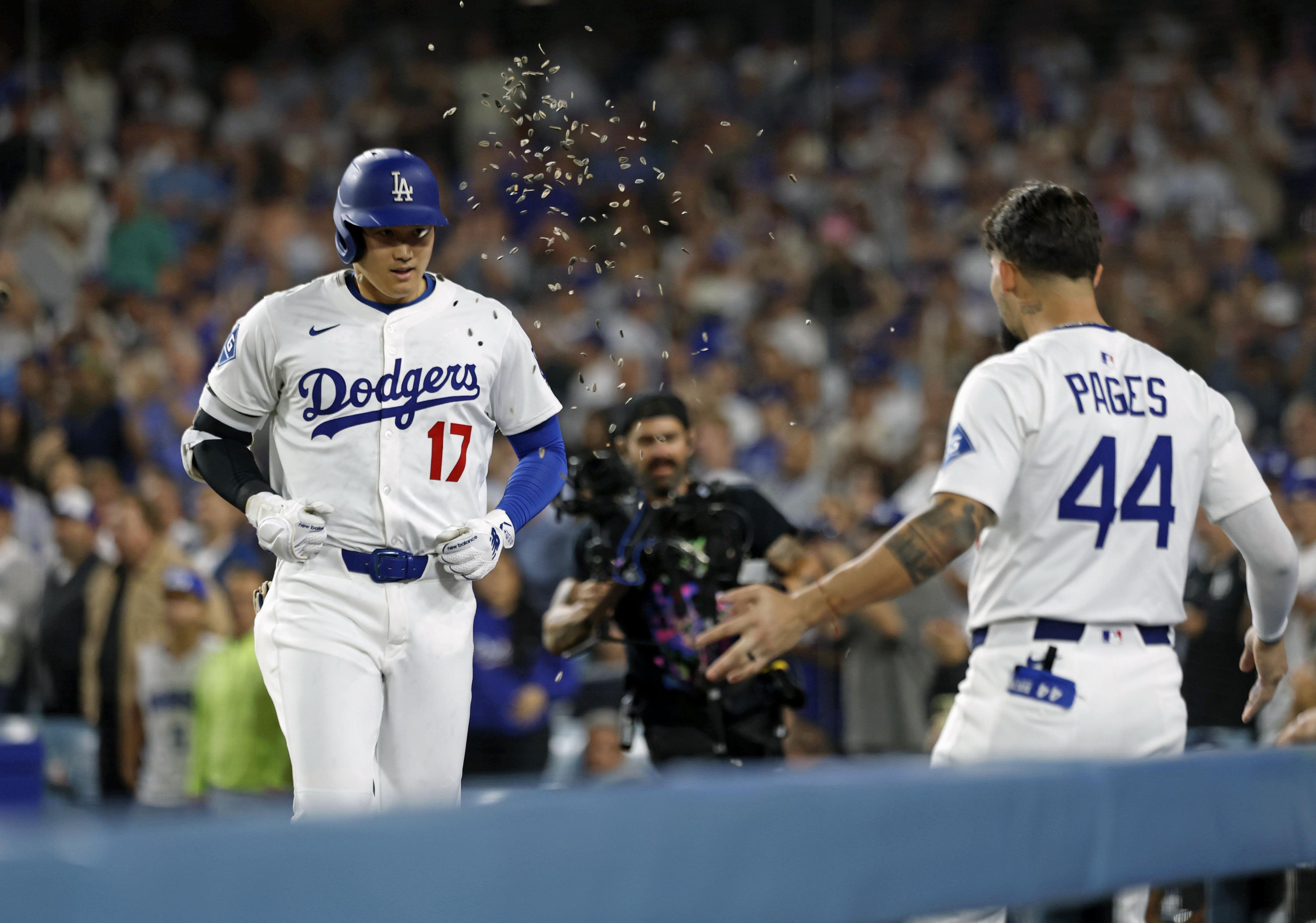 2025年5月30日,大谷主場對陣紐約洋基隊時單場轟出雙響砲。隊友撒向日葵籽慶祝。(共同社)