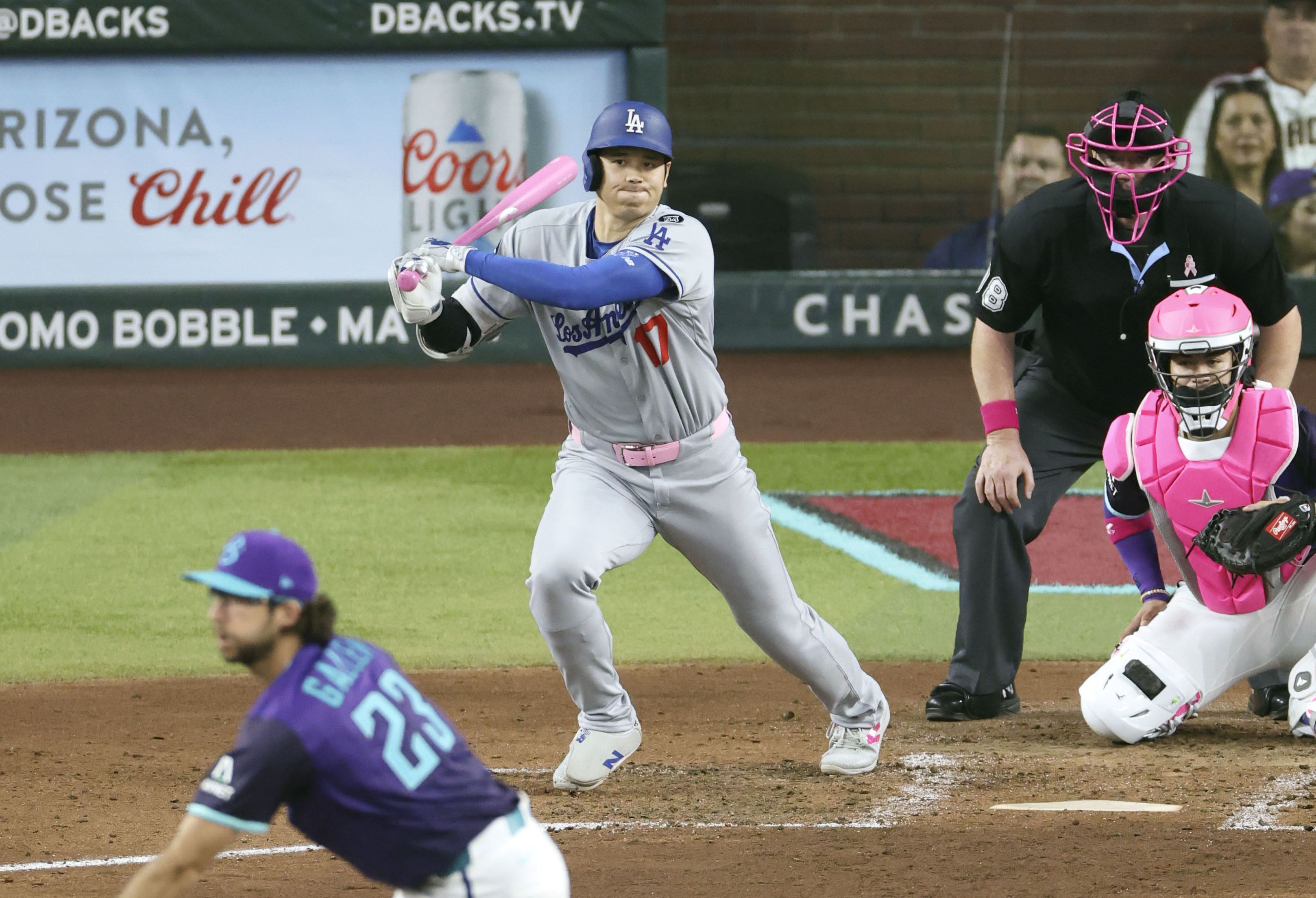 2025年5月11日,大谷客場對陣亞利桑那響尾蛇隊時擊出中前安打。(共同社)