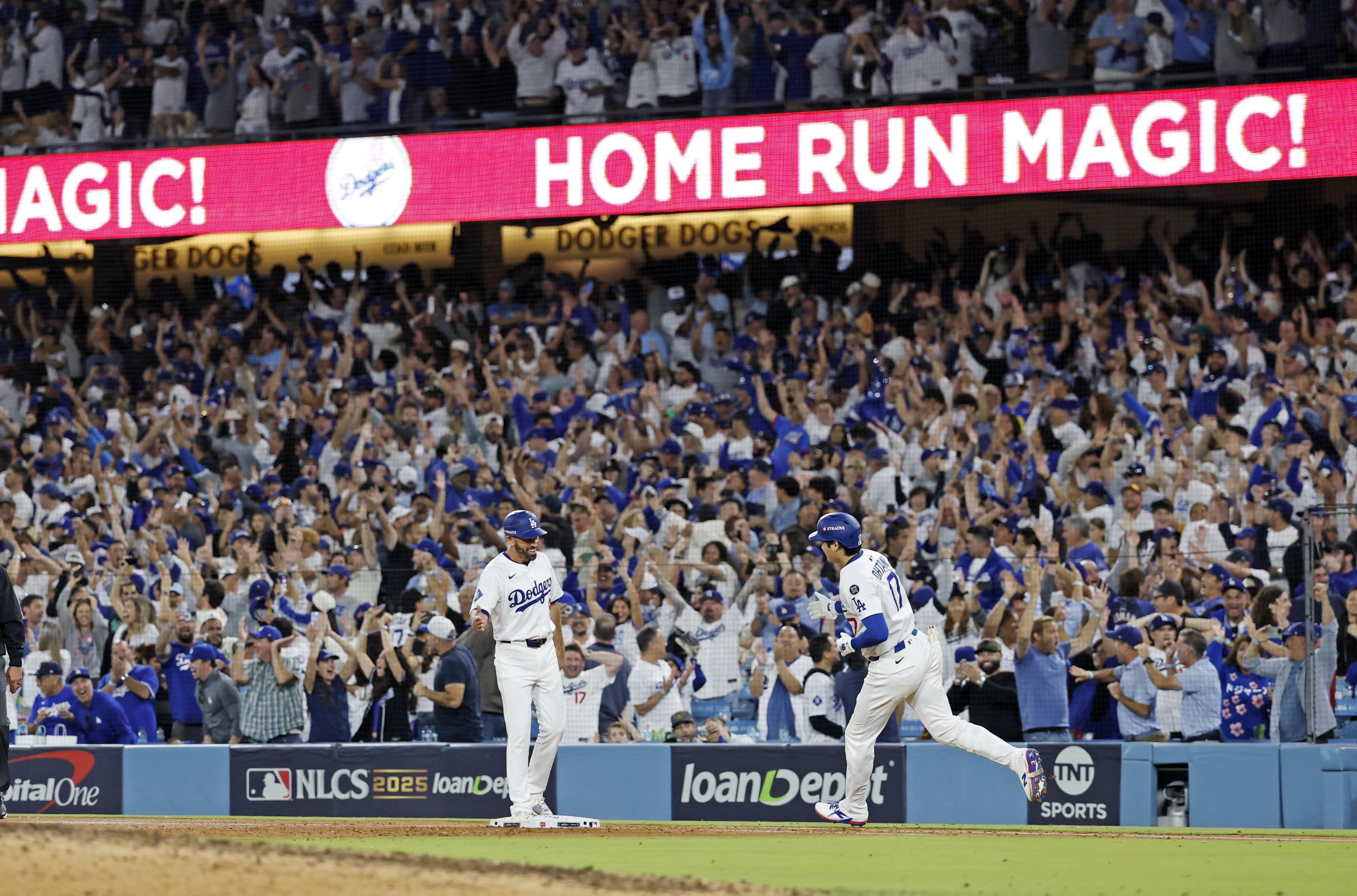 大谷在第七局轟出第二支全壘打,幫助道奇隊追平比分。比賽最終戰至延長賽第十八局才分出勝負。2025年10月27日攝於洛杉磯。(共同社)