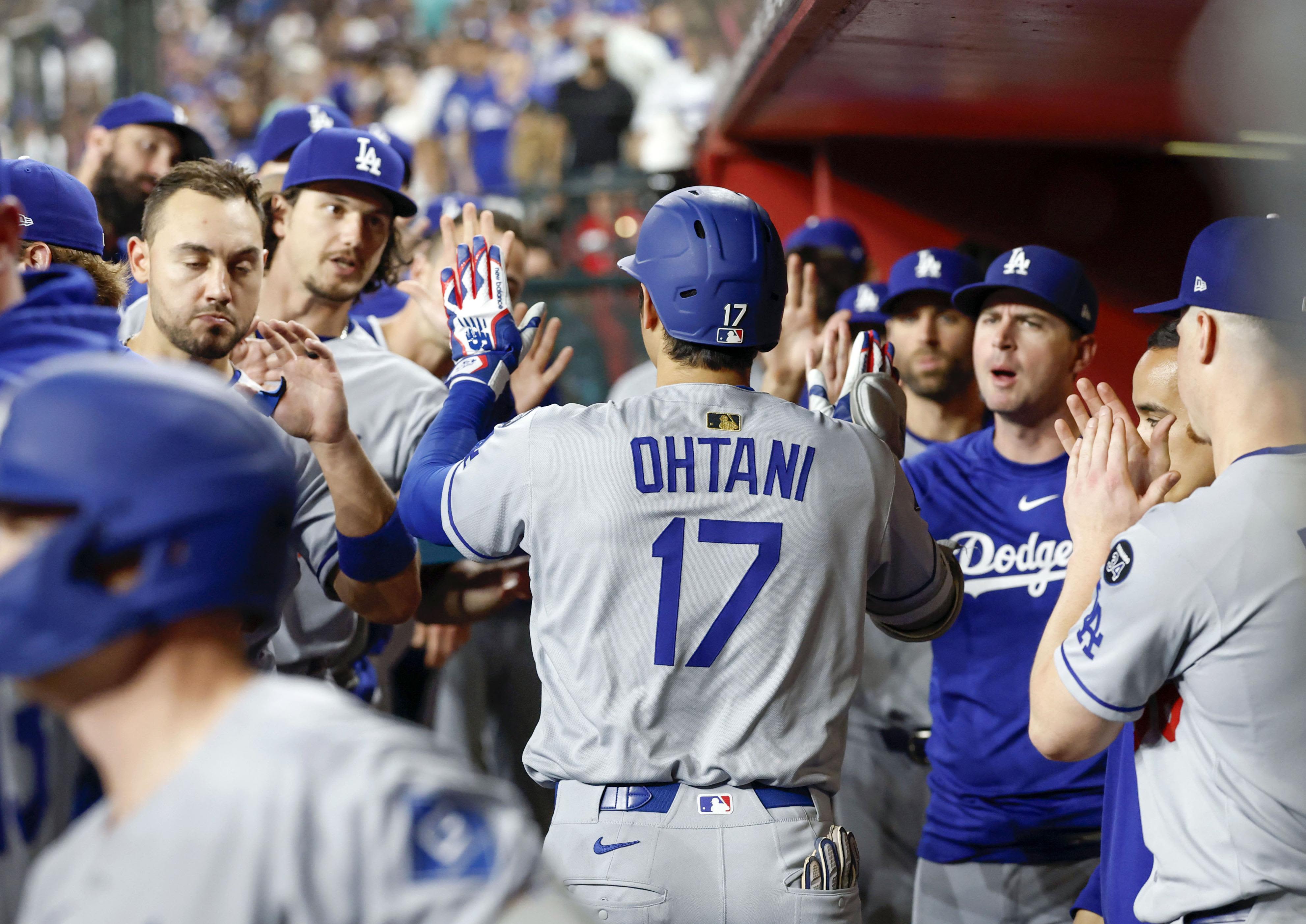 2025年5月8日,大谷對陣響尾蛇隊時擊出賽季第11支全壘打,隊友在場邊迎接。(共同社)