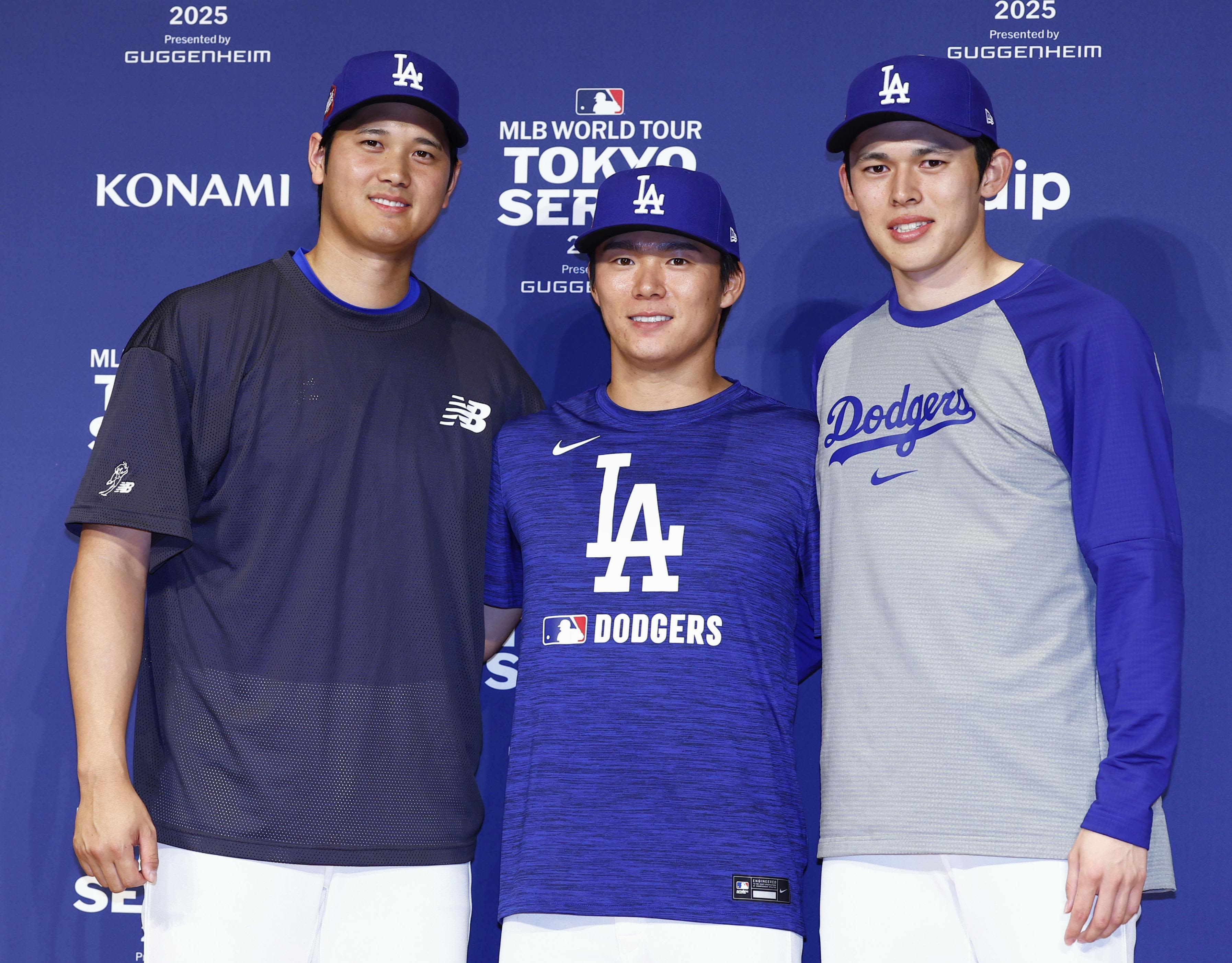 2025年3月14日,道奇隊日籍球員大谷、山本由伸、佐佐木朗希在東京召開記者會後合影。道奇與芝加哥小熊隊的賽季揭幕系列賽定於3月18日和19日在東京巨蛋舉行。(共同社)