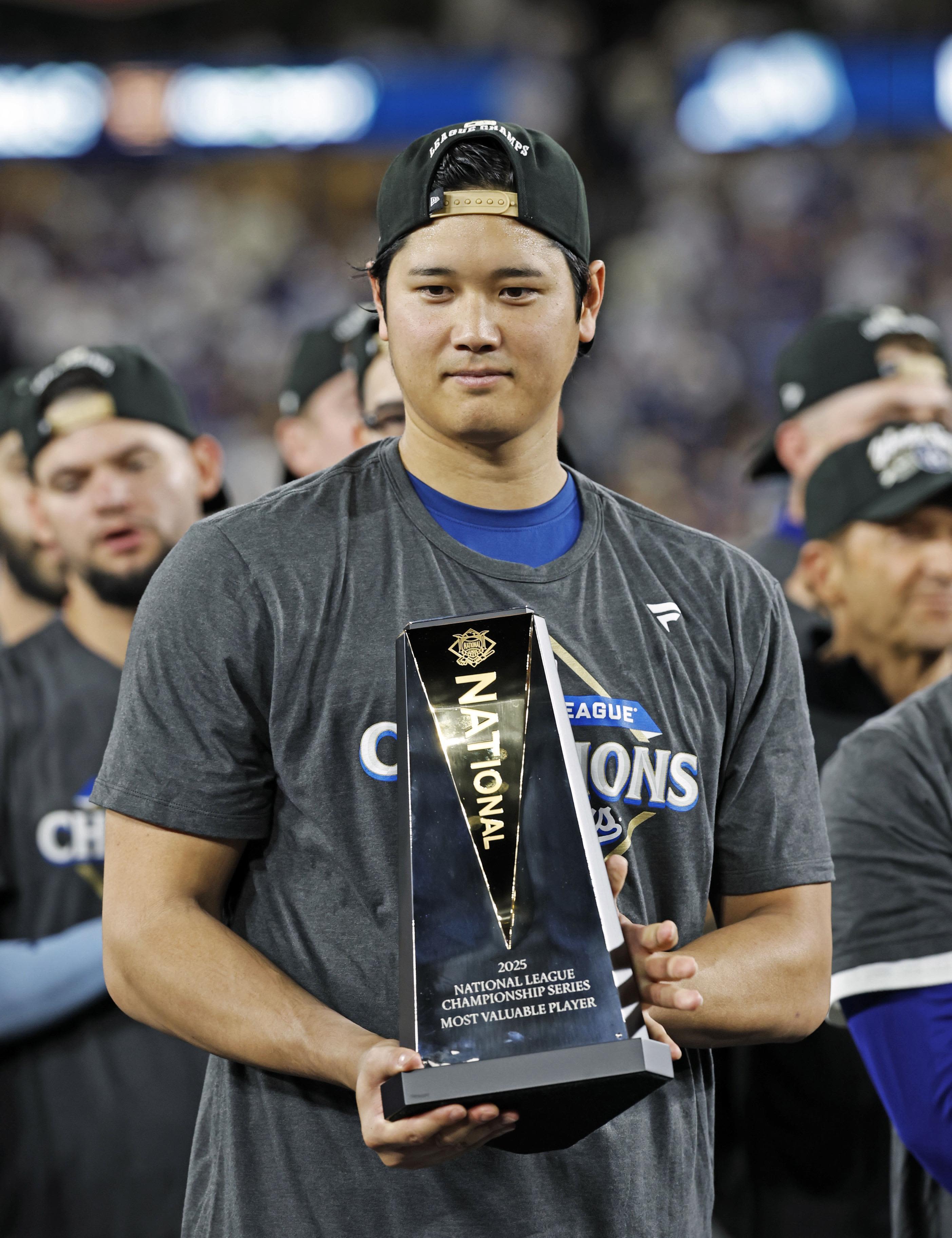大谷當選國聯冠軍系列賽MVP。2025年10月17日攝於洛杉磯。(共同社)