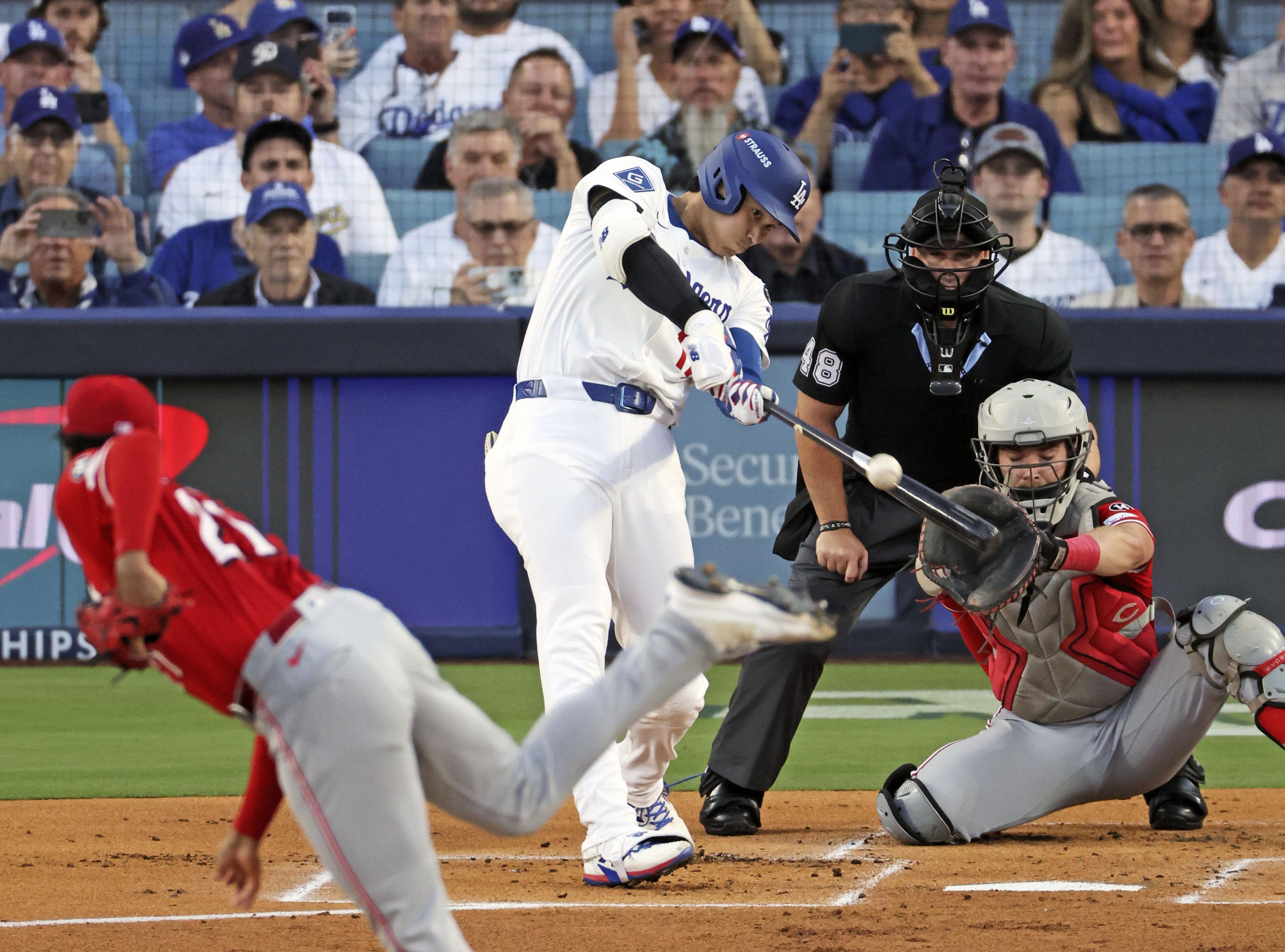 2025年10月28日的世界大賽G4,大谷在第三局被小葛雷諾擊出两分砲。世界大賽「二刀流」首秀以敗投收場。攝於洛杉磯。(共同社)