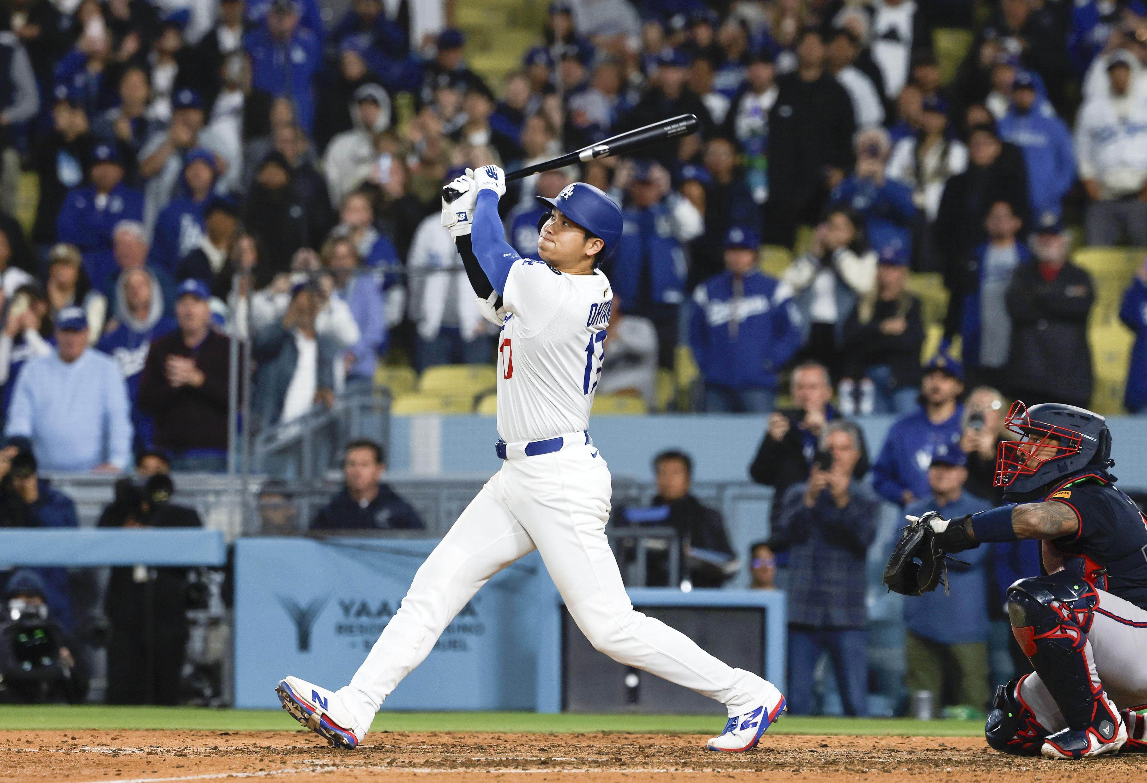 2025年4月2日,美職棒常規賽大谷對陣多倫多藍鳥隊時,轟出再見全壘打。這是大谷的賽季第三轟。攝於洛杉磯。(共同社)