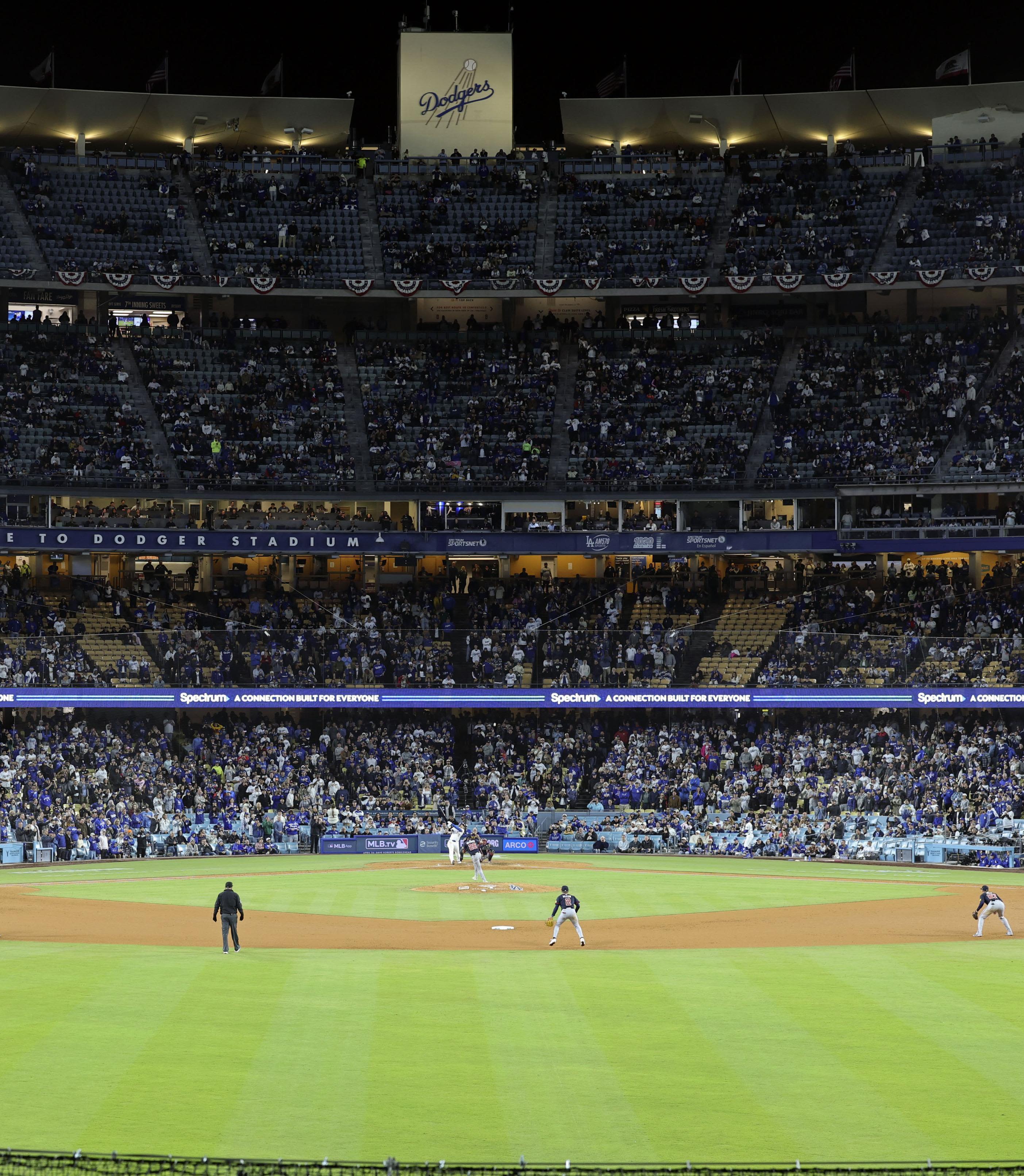 2025年4月2日,道奇隊在主場向前來觀賽的球迷贈送大谷搖頭公仔。(共同社)