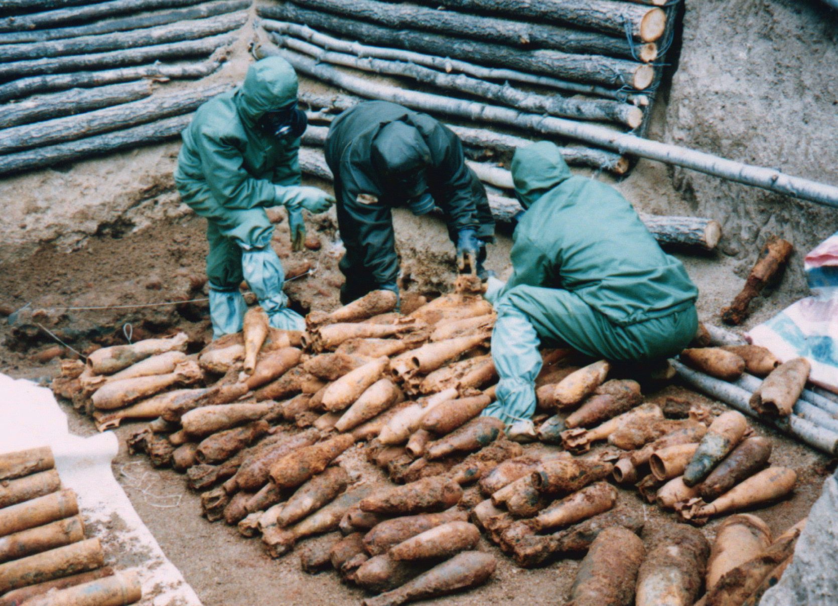 1996年5月,日本政府的调查队对日军遗弃在中国吉林省敦化市近郊的化学武器(毒气弹)进行初步调查。(日本外务省供图)