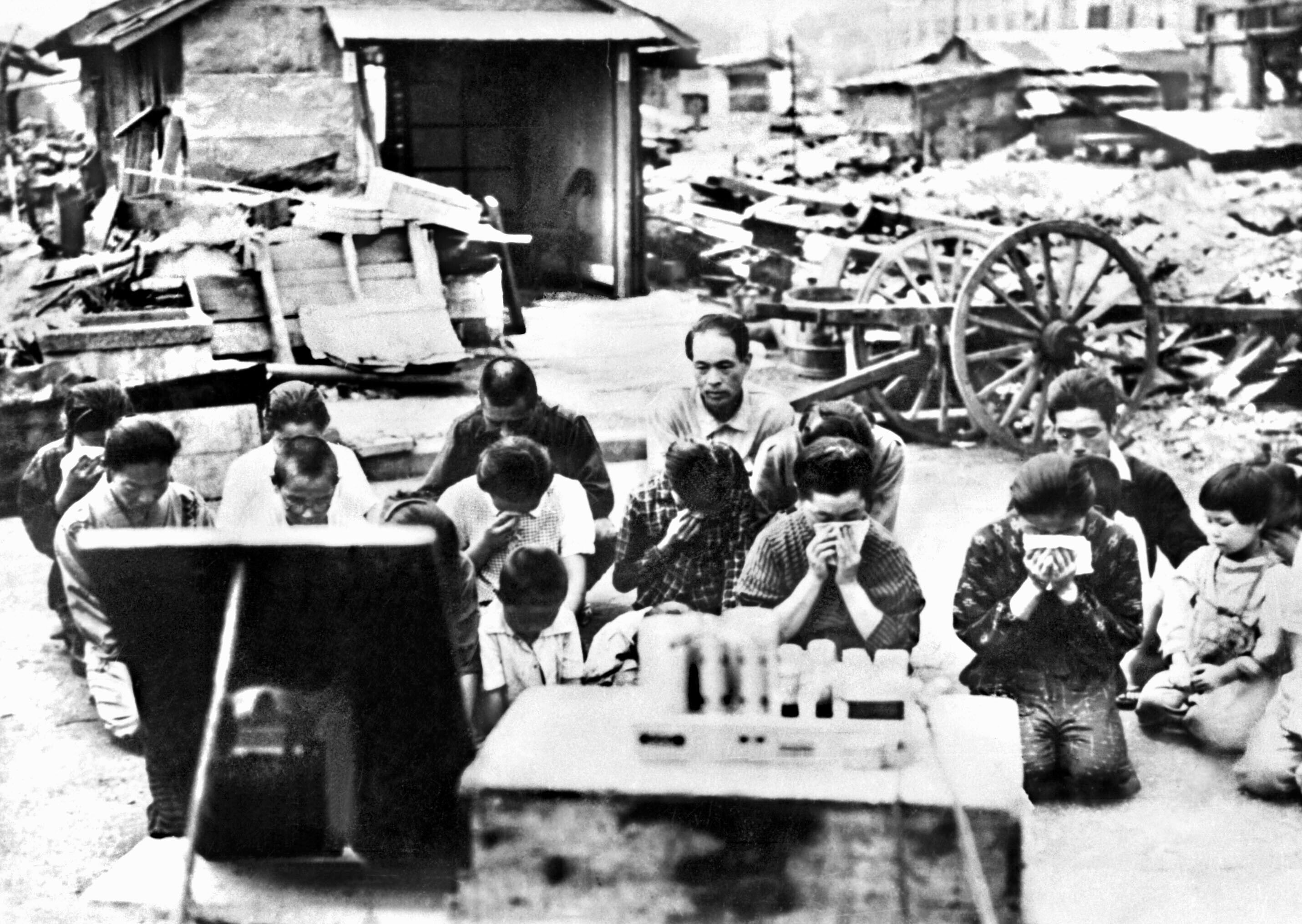 1945年8月15日,日本国民收听昭和天皇宣布战败的“玉音放送”广播。