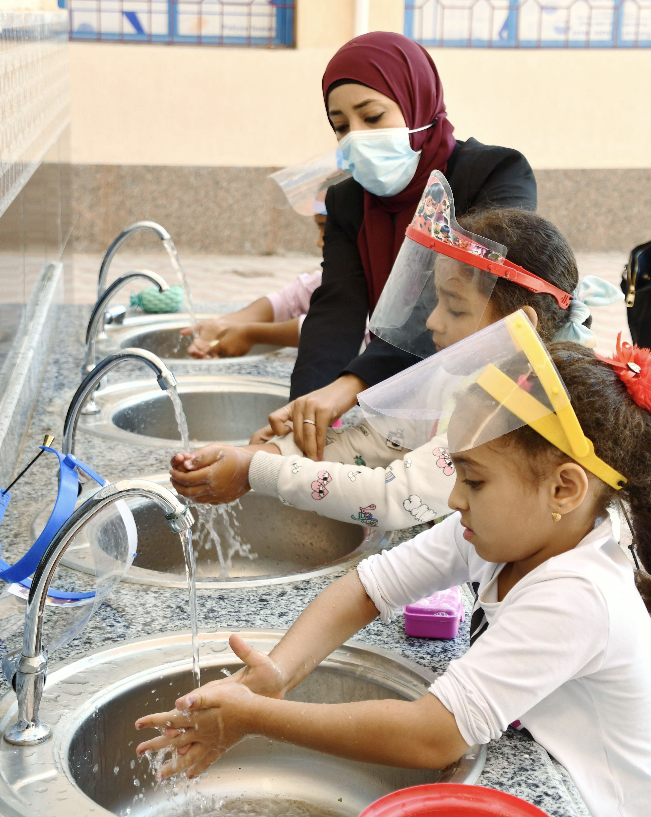 Students wash their hands at an Egyptian-Japanese school in Sharm el-Sheikh, Egypt, in November 2020. (Kyodo)
