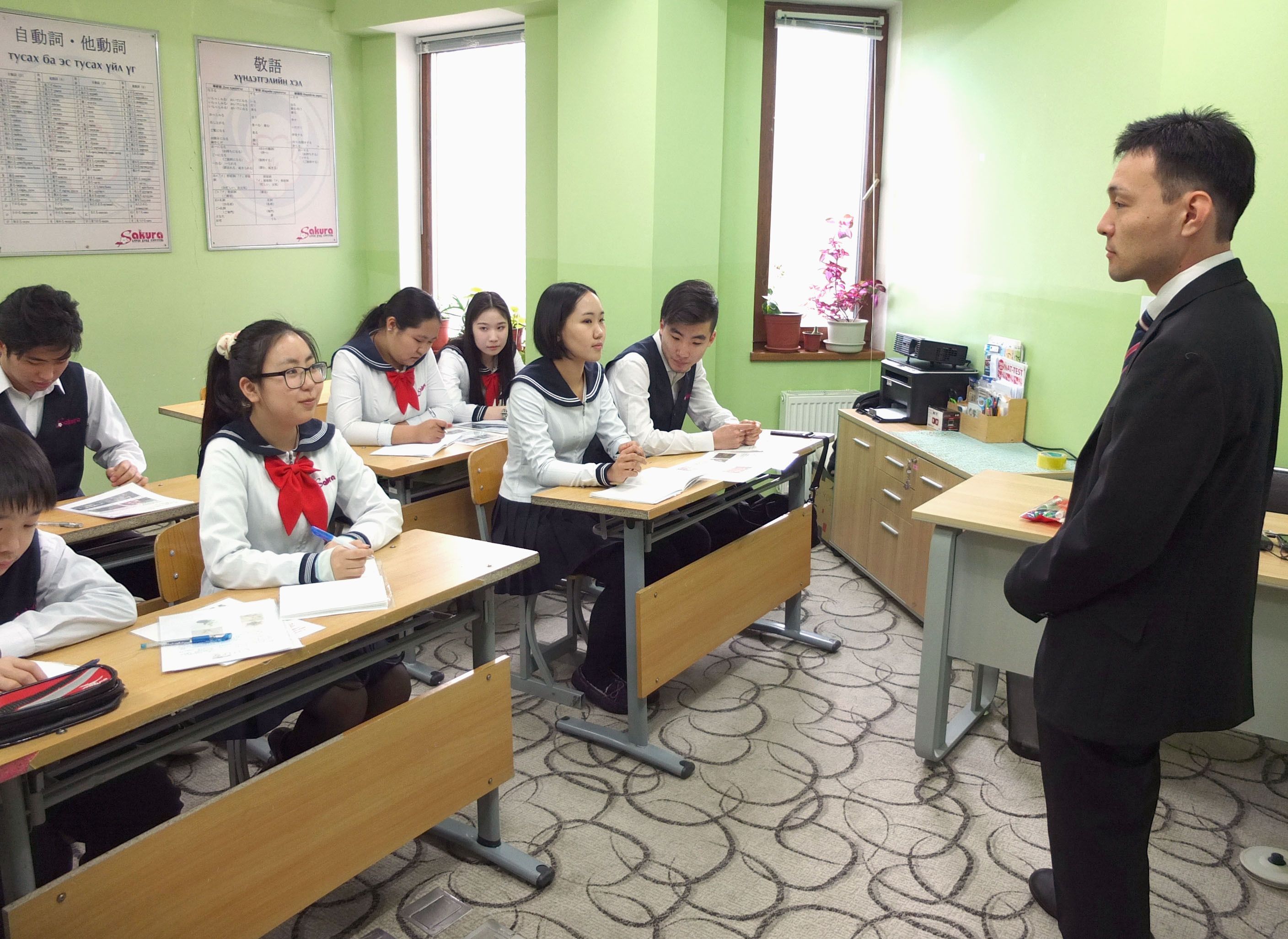 Students in uniform sit in front of their Japanese teacher at "Sakura Gakko,” a school that incorporates Japanese-style discipline and culture, outside of Ulaanbaatar, Mongolia, in April 2016.